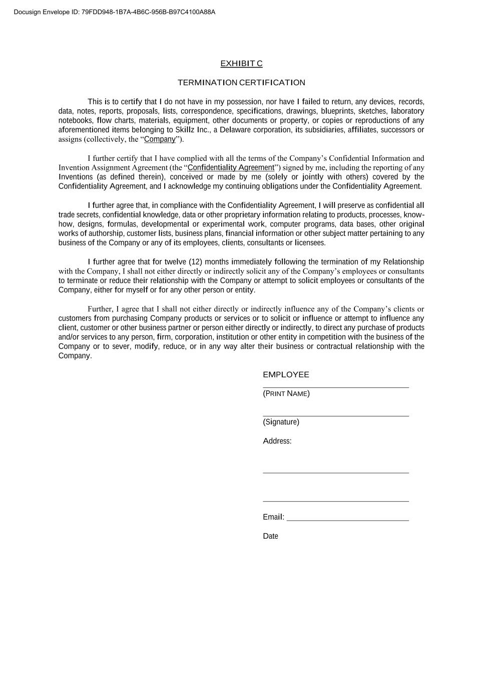 EXHIBIT C TERMINATION CERTIFICATION This is to certify that I do not have in my possession, nor have I failed to return, any devices, records, data, notes, reports, proposals, lists, correspondence, specifications, drawings, blueprints, sketches, laboratory notebooks, flow charts, materials, equipment, other documents or property, or copies or reproductions of any aforementioned items belonging to Skillz Inc., a Delaware corporation, its subsidiaries, affiliates, successors or assigns (collectively, the “Company”). I further certify that I have complied with all the terms of the Company’s Confidential Information and Invention Assignment Agreement (the “Confidentiality Agreement”) signed by me, including the reporting of any Inventions (as defined therein), conceived or made by me (solely or jointly with others) covered by the Confidentiality Agreement, and I acknowledge my continuing obligations under the Confidentiality Agreement. I further agree that, in compliance with the Confidentiality Agreement, I will preserve as confidential all trade secrets, confidential knowledge, data or other proprietary information relating to products, processes, know- how, designs, formulas, developmental or experimental work, computer programs, data bases, other original works of authorship, customer lists, business plans, financial information or other subject matter pertaining to any business of the Company or any of its employees, clients, consultants or licensees. I further agree that for twelve (12) months immediately following the termination of my Relationship with the Company, I shall not either directly or indirectly solicit any of the Company’s employees or consultants to terminate or reduce their relationship with the Company or attempt to solicit employees or consultants of the Company, either for myself or for any other person or entity. Further, I agree that I shall not either directly or indirectly influence any of the Company’s clients or customers from purchasing Company products or services or to solicit or influence or attempt to influence any client, customer or other business partner or person either directly or indirectly, to direct any purchase of products and/or services to any person, firm, corporation, institution or other entity in competition with the business of the Company or to sever, modify, reduce, or in any way alter their business or contractual relationship with the Company. EMPLOYEE (PRINT NAME) (Signature) Address: Email: Date Docusign Envelope ID: 79FDD948-1B7A-4B6C-956B-B97C4100A88A
