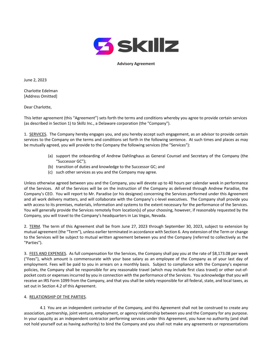 Advisory Agreement June 2, 2023 Charlotte Edelman [Address Omitted] Dear Charlotte, This letter agreement (this “Agreement”) sets forth the terms and conditions whereby you agree to provide certain services (as described in Section 1) to Skillz Inc., a Delaware corporation (the "Company"). 1. SERVICES. The Company hereby engages you, and you hereby accept such engagement, as an advisor to provide certain services to the Company on the terms and conditions set forth in the following sentence. At such times and places as may be mutually agreed, you will provide to the Company the following services (the "Services"): (a) support the onboarding of Andrew Dahlinghaus as General Counsel and Secretary of the Company (the “Successor GC”); (b) transition of duties and knowledge to the Successor GC; and (c) such other services as you and the Company may agree. Unless otherwise agreed between you and the Company, you will devote up to 40 hours per calendar week in performance of the Services. All of the Services will be on the instruction of the Company as delivered through Andrew Paradise, the Company’s CEO. You will report to Mr. Paradise (or his designee) concerning the Services performed under this Agreement and all work delivery matters, and will collaborate with the Company’s c-level executives. The Company shall provide you with access to its premises, materials, information and systems to the extent necessary for the performance of the Services. You will generally provide the Services remotely from location(s) of your choosing, however, if reasonably requested by the Company, you will travel to the Company’s headquarters in Las Vegas, Nevada. 2. TERM. The term of this Agreement shall be from June 27, 2023 through September 30, 2023, subject to extension by mutual agreement (the “Term”), unless earlier terminated in accordance with Section 6. Any extension of the Term or change to the Services will be subject to mutual written agreement between you and the Company (referred to collectively as the "Parties"). 3. FEES AND EXPENSES. As full compensation for the Services, the Company shall pay you at the rate of $8,173.08 per week (“Fees”), which amount is commensurate with your base salary as an employee of the Company as of your last day of employment. Fees will be paid to you in arrears on a monthly basis. Subject to compliance with the Company’s expense policies, the Company shall be responsible for any reasonable travel (which may include first class travel) or other out-of- pocket costs or expenses incurred by you in connection with the performance of the Services. You acknowledge that you will receive an IRS Form 1099 from the Company, and that you shall be solely responsible for all federal, state, and local taxes, as set out in Section 4.2 of this Agreement. 4. RELATIONSHIP OF THE PARTIES. 4.1 You are an independent contractor of the Company, and this Agreement shall not be construed to create any association, partnership, joint venture, employment, or agency relationship between you and the Company for any purpose. In your capacity as an independent contractor performing services under this Agreement, you have no authority (and shall not hold yourself out as having authority) to bind the Company and you shall not make any agreements or representations