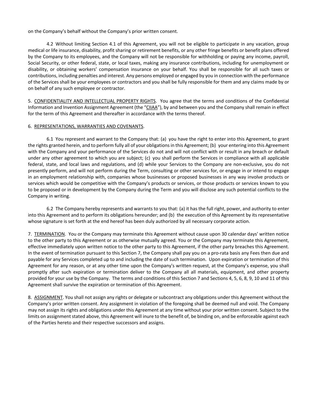 on the Company’s behalf without the Company’s prior written consent. 4.2 Without limiting Section 4.1 of this Agreement, you will not be eligible to participate in any vacation, group medical or life insurance, disability, profit sharing or retirement benefits, or any other fringe benefits or benefit plans offered by the Company to its employees, and the Company will not be responsible for withholding or paying any income, payroll, Social Security, or other federal, state, or local taxes, making any insurance contributions, including for unemployment or disability, or obtaining workers’ compensation insurance on your behalf. You shall be responsible for all such taxes or contributions, including penalties and interest. Any persons employed or engaged by you in connection with the performance of the Services shall be your employees or contractors and you shall be fully responsible for them and any claims made by or on behalf of any such employee or contractor. 5. CONFIDENTIALITY AND INTELLECTUAL PROPERTY RIGHTS. You agree that the terms and conditions of the Confidential Information and Invention Assignment Agreement (the “CIIAA”), by and between you and the Company shall remain in effect for the term of this Agreement and thereafter in accordance with the terms thereof. 6. REPRESENTATIONS, WARRANTIES AND COVENANTS. 6.1 You represent and warrant to the Company that: (a) you have the right to enter into this Agreement, to grant the rights granted herein, and to perform fully all of your obligations in this Agreement; (b) your entering into this Agreement with the Company and your performance of the Services do not and will not conflict with or result in any breach or default under any other agreement to which you are subject; (c) you shall perform the Services in compliance with all applicable federal, state, and local laws and regulations, and (d) while your Services to the Company are non-exclusive, you do not presently perform, and will not perform during the Term, consulting or other services for, or engage in or intend to engage in an employment relationship with, companies whose businesses or proposed businesses in any way involve products or services which would be competitive with the Company’s products or services, or those products or services known to you to be proposed or in development by the Company during the Term and you will disclose any such potential conflicts to the Company in writing. 6.2 The Company hereby represents and warrants to you that: (a) it has the full right, power, and authority to enter into this Agreement and to perform its obligations hereunder; and (b) the execution of this Agreement by its representative whose signature is set forth at the end hereof has been duly authorized by all necessary corporate action. 7. TERMINATION. You or the Company may terminate this Agreement without cause upon 30 calendar days' written notice to the other party to this Agreement or as otherwise mutually agreed. You or the Company may terminate this Agreement, effective immediately upon written notice to the other party to this Agreement, if the other party breaches this Agreement. In the event of termination pursuant to this Section 7, the Company shall pay you on a pro-rata basis any Fees then due and payable for any Services completed up to and including the date of such termination. Upon expiration or termination of this Agreement for any reason, or at any other time upon the Company's written request, at the Company’s expense, you shall promptly after such expiration or termination deliver to the Company all all materials, equipment, and other property provided for your use by the Company. The terms and conditions of this Section 7 and Sections 4, 5, 6, 8, 9, 10 and 11 of this Agreement shall survive the expiration or termination of this Agreement. 8. ASSIGNMENT. You shall not assign any rights or delegate or subcontract any obligations under this Agreement without the Company’s prior written consent. Any assignment in violation of the foregoing shall be deemed null and void. The Company may not assign its rights and obligations under this Agreement at any time without your prior written consent. Subject to the limits on assignment stated above, this Agreement will inure to the benefit of, be binding on, and be enforceable against each of the Parties hereto and their respective successors and assigns.