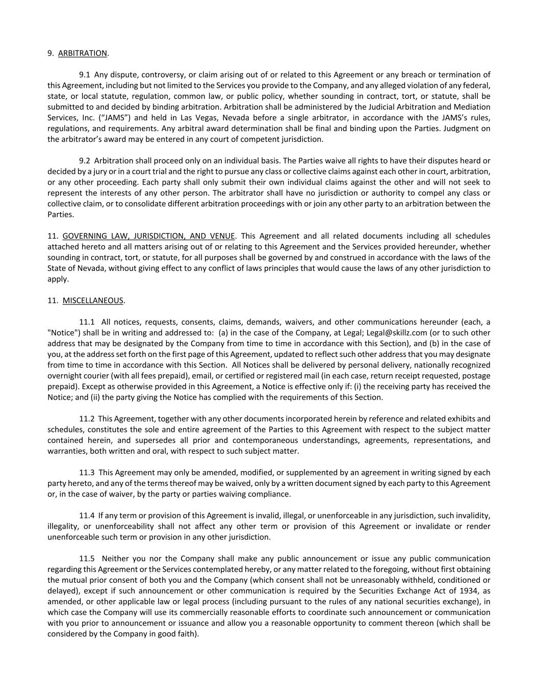9. ARBITRATION. 9.1 Any dispute, controversy, or claim arising out of or related to this Agreement or any breach or termination of this Agreement, including but not limited to the Services you provide to the Company, and any alleged violation of any federal, state, or local statute, regulation, common law, or public policy, whether sounding in contract, tort, or statute, shall be submitted to and decided by binding arbitration. Arbitration shall be administered by the Judicial Arbitration and Mediation Services, Inc. (“JAMS”) and held in Las Vegas, Nevada before a single arbitrator, in accordance with the JAMS’s rules, regulations, and requirements. Any arbitral award determination shall be final and binding upon the Parties. Judgment on the arbitrator’s award may be entered in any court of competent jurisdiction. 9.2 Arbitration shall proceed only on an individual basis. The Parties waive all rights to have their disputes heard or decided by a jury or in a court trial and the right to pursue any class or collective claims against each other in court, arbitration, or any other proceeding. Each party shall only submit their own individual claims against the other and will not seek to represent the interests of any other person. The arbitrator shall have no jurisdiction or authority to compel any class or collective claim, or to consolidate different arbitration proceedings with or join any other party to an arbitration between the Parties. 11. GOVERNING LAW, JURISDICTION, AND VENUE. This Agreement and all related documents including all schedules attached hereto and all matters arising out of or relating to this Agreement and the Services provided hereunder, whether sounding in contract, tort, or statute, for all purposes shall be governed by and construed in accordance with the laws of the State of Nevada, without giving effect to any conflict of laws principles that would cause the laws of any other jurisdiction to apply. 11. MISCELLANEOUS. 11.1 All notices, requests, consents, claims, demands, waivers, and other communications hereunder (each, a "Notice") shall be in writing and addressed to: (a) in the case of the Company, at Legal; Legal@skillz.com (or to such other address that may be designated by the Company from time to time in accordance with this Section), and (b) in the case of you, at the address set forth on the first page of this Agreement, updated to reflect such other address that you may designate from time to time in accordance with this Section. All Notices shall be delivered by personal delivery, nationally recognized overnight courier (with all fees prepaid), email, or certified or registered mail (in each case, return receipt requested, postage prepaid). Except as otherwise provided in this Agreement, a Notice is effective only if: (i) the receiving party has received the Notice; and (ii) the party giving the Notice has complied with the requirements of this Section. 11.2 This Agreement, together with any other documents incorporated herein by reference and related exhibits and schedules, constitutes the sole and entire agreement of the Parties to this Agreement with respect to the subject matter contained herein, and supersedes all prior and contemporaneous understandings, agreements, representations, and warranties, both written and oral, with respect to such subject matter. 11.3 This Agreement may only be amended, modified, or supplemented by an agreement in writing signed by each party hereto, and any of the terms thereof may be waived, only by a written document signed by each party to this Agreement or, in the case of waiver, by the party or parties waiving compliance. 11.4 If any term or provision of this Agreement is invalid, illegal, or unenforceable in any jurisdiction, such invalidity, illegality, or unenforceability shall not affect any other term or provision of this Agreement or invalidate or render unenforceable such term or provision in any other jurisdiction. 11.5 Neither you nor the Company shall make any public announcement or issue any public communication regarding this Agreement or the Services contemplated hereby, or any matter related to the foregoing, without first obtaining the mutual prior consent of both you and the Company (which consent shall not be unreasonably withheld, conditioned or delayed), except if such announcement or other communication is required by the Securities Exchange Act of 1934, as amended, or other applicable law or legal process (including pursuant to the rules of any national securities exchange), in which case the Company will use its commercially reasonable efforts to coordinate such announcement or communication with you prior to announcement or issuance and allow you a reasonable opportunity to comment thereon (which shall be considered by the Company in good faith).