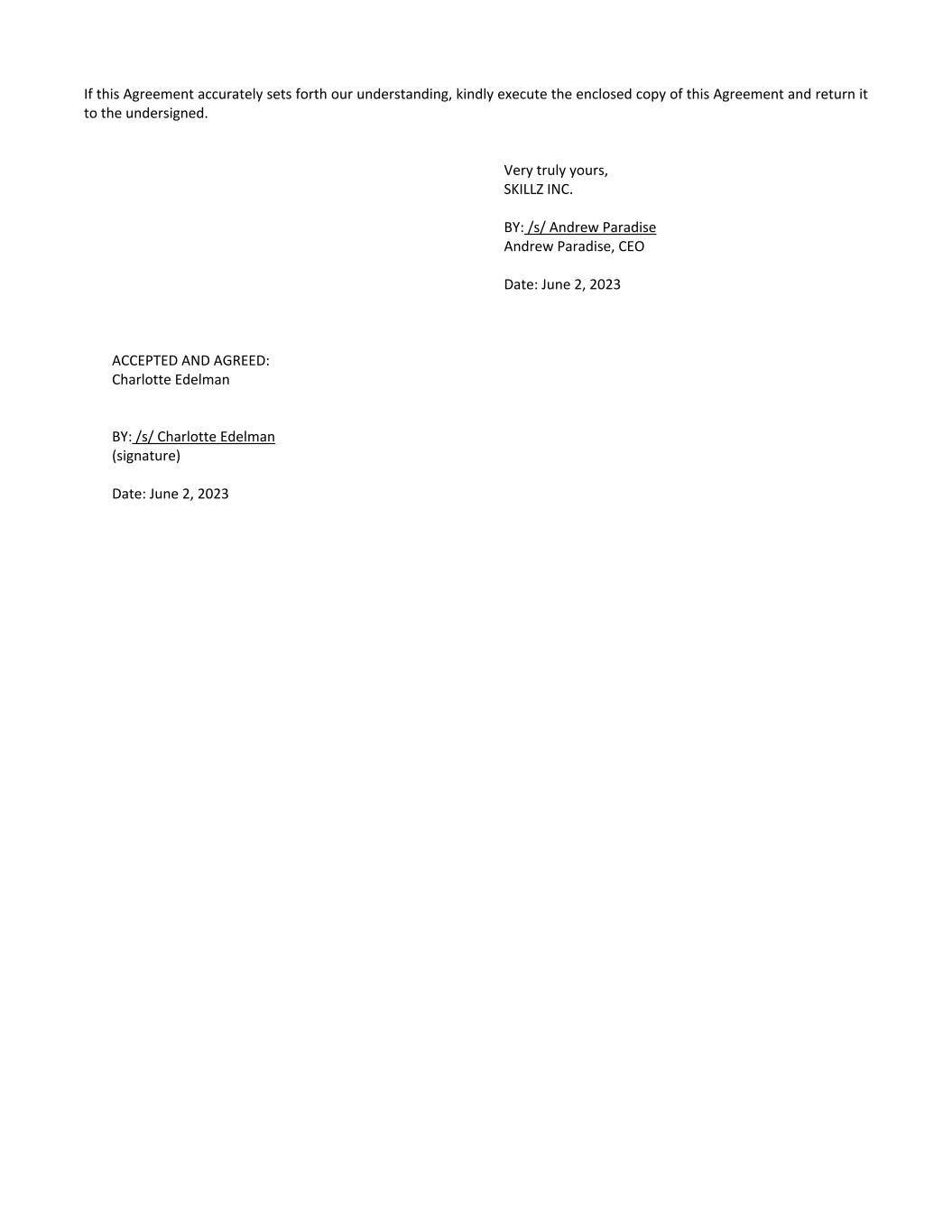 If this Agreement accurately sets forth our understanding, kindly execute the enclosed copy of this Agreement and return it to the undersigned. Very truly yours, SKILLZ INC. BY: /s/ Andrew Paradise Andrew Paradise, CEO Date: June 2, 2023 ACCEPTED AND AGREED: Charlotte Edelman BY: /s/ Charlotte Edelman (signature) Date: June 2, 2023