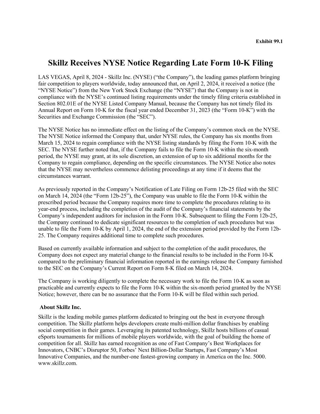Exhibit 99.1 Skillz Receives NYSE Notice Regarding Late Form 10-K Filing LAS VEGAS, April 8, 2024 - Skillz Inc. (NYSE) (“the Company”), the leading games platform bringing fair competition to players worldwide, today announced that, on April 2, 2024, it received a notice (the “NYSE Notice”) from the New York Stock Exchange (the “NYSE”) that the Company is not in compliance with the NYSE’s continued listing requirements under the timely filing criteria established in Section 802.01E of the NYSE Listed Company Manual, because the Company has not timely filed its Annual Report on Form 10-K for the fiscal year ended December 31, 2023 (the “Form 10-K”) with the Securities and Exchange Commission (the “SEC”). The NYSE Notice has no immediate effect on the listing of the Company’s common stock on the NYSE. The NYSE Notice informed the Company that, under NYSE rules, the Company has six months from March 15, 2024 to regain compliance with the NYSE listing standards by filing the Form 10-K with the SEC. The NYSE further noted that, if the Company fails to file the Form 10-K within the six-month period, the NYSE may grant, at its sole discretion, an extension of up to six additional months for the Company to regain compliance, depending on the specific circumstances. The NYSE Notice also notes that the NYSE may nevertheless commence delisting proceedings at any time if it deems that the circumstances warrant. As previously reported in the Company’s Notification of Late Filing on Form 12b-25 filed with the SEC on March 14, 2024 (the “Form 12b-25”), the Company was unable to file the Form 10-K within the prescribed period because the Company requires more time to complete the procedures relating to its year-end process, including the completion of the audit of the Company’s financial statements by the Company’s independent auditors for inclusion in the Form 10-K. Subsequent to filing the Form 12b-25, the Company continued to dedicate significant resources to the completion of such procedures but was unable to file the Form 10-K by April 1, 2024, the end of the extension period provided by the Form 12b- 25. The Company requires additional time to complete such procedures. Based on currently available information and subject to the completion of the audit procedures, the Company does not expect any material change to the financial results to be included in the Form 10-K compared to the preliminary financial information reported in the earnings release the Company furnished to the SEC on the Company’s Current Report on Form 8-K filed on March 14, 2024. The Company is working diligently to complete the necessary work to file the Form 10-K as soon as practicable and currently expects to file the Form 10-K within the six-month period granted by the NYSE Notice; however, there can be no assurance that the Form 10-K will be filed within such period. About Skillz Inc. Skillz is the leading mobile games platform dedicated to bringing out the best in everyone through competition. The Skillz platform helps developers create multi-million dollar franchises by enabling social competition in their games. Leveraging its patented technology, Skillz hosts billions of casual eSports tournaments for millions of mobile players worldwide, with the goal of building the home of competition for all. Skillz has earned recognition as one of Fast Company’s Best Workplaces for Innovators, CNBC’s Disruptor 50, Forbes’ Next Billion-Dollar Startups, Fast Company’s Most Innovative Companies, and the number-one fastest-growing company in America on the Inc. 5000. www.skillz.com.