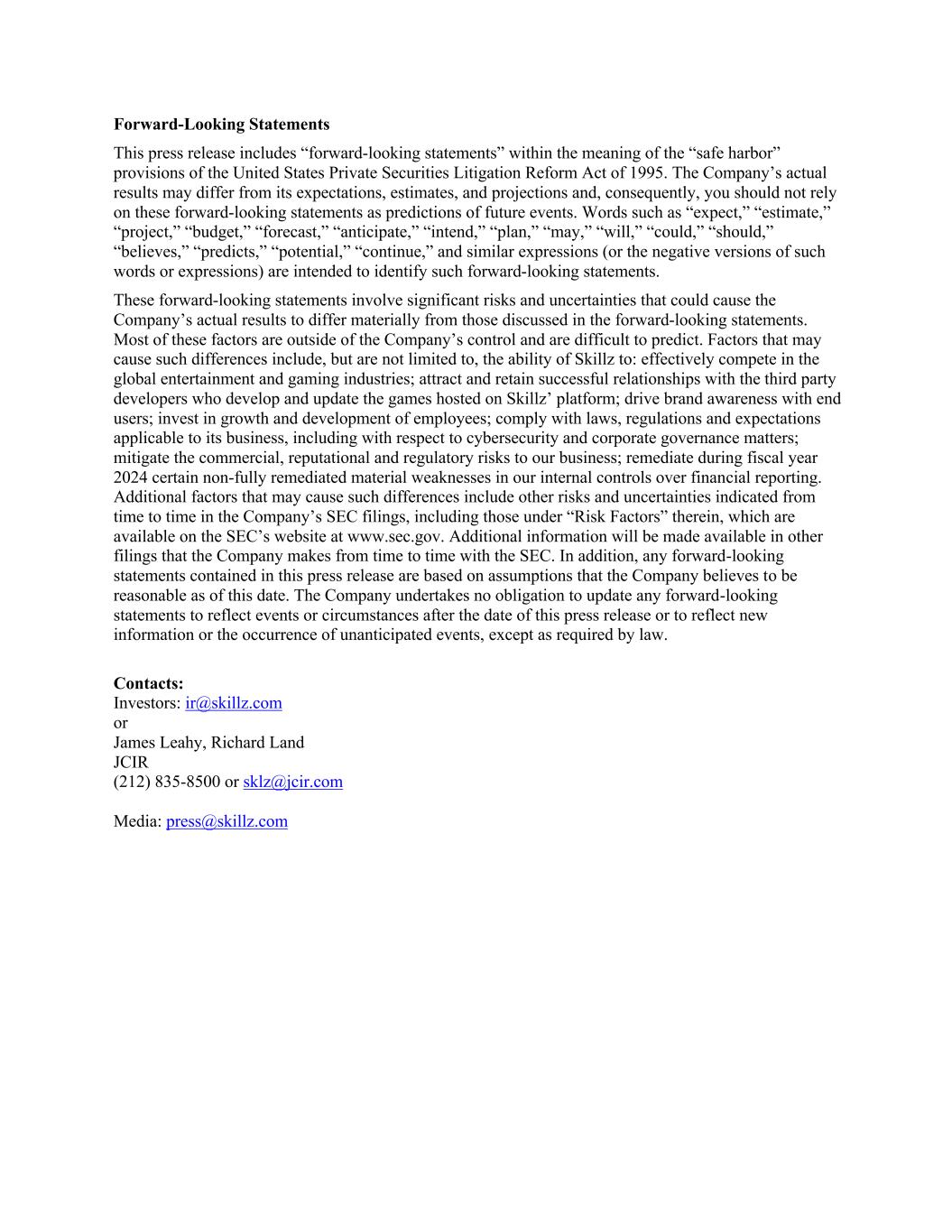 Forward-Looking Statements This press release includes “forward-looking statements” within the meaning of the “safe harbor” provisions of the United States Private Securities Litigation Reform Act of 1995. The Company’s actual results may differ from its expectations, estimates, and projections and, consequently, you should not rely on these forward-looking statements as predictions of future events. Words such as “expect,” “estimate,” “project,” “budget,” “forecast,” “anticipate,” “intend,” “plan,” “may,” “will,” “could,” “should,” “believes,” “predicts,” “potential,” “continue,” and similar expressions (or the negative versions of such words or expressions) are intended to identify such forward-looking statements. These forward-looking statements involve significant risks and uncertainties that could cause the Company’s actual results to differ materially from those discussed in the forward-looking statements. Most of these factors are outside of the Company’s control and are difficult to predict. Factors that may cause such differences include, but are not limited to, the ability of Skillz to: effectively compete in the global entertainment and gaming industries; attract and retain successful relationships with the third party developers who develop and update the games hosted on Skillz’ platform; drive brand awareness with end users; invest in growth and development of employees; comply with laws, regulations and expectations applicable to its business, including with respect to cybersecurity and corporate governance matters; mitigate the commercial, reputational and regulatory risks to our business; remediate during fiscal year 2024 certain non-fully remediated material weaknesses in our internal controls over financial reporting. Additional factors that may cause such differences include other risks and uncertainties indicated from time to time in the Company’s SEC filings, including those under “Risk Factors” therein, which are available on the SEC’s website at www.sec.gov. Additional information will be made available in other filings that the Company makes from time to time with the SEC. In addition, any forward-looking statements contained in this press release are based on assumptions that the Company believes to be reasonable as of this date. The Company undertakes no obligation to update any forward-looking statements to reflect events or circumstances after the date of this press release or to reflect new information or the occurrence of unanticipated events, except as required by law. Contacts: Investors: ir@skillz.com or James Leahy, Richard Land JCIR (212) 835-8500 or sklz@jcir.com Media: press@skillz.com