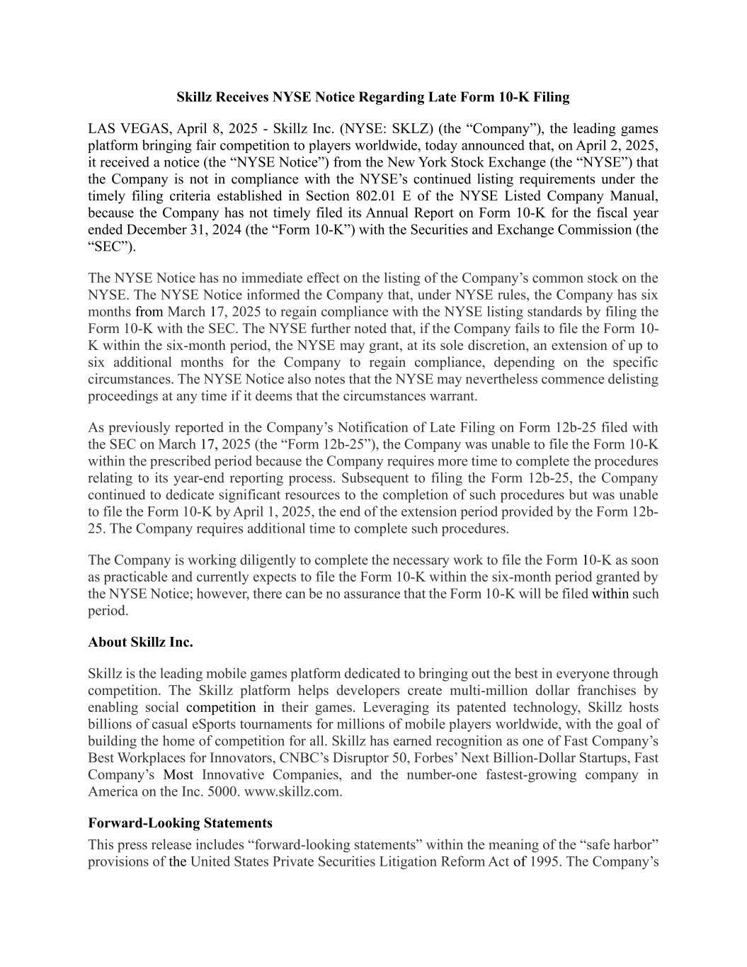 Skillz Receives NYSE Notice Regarding Late Form 10-K Filing LAS VEGAS, April 8, 2025 - Skillz Inc. (NYSE: SKLZ) (the “Company”), the leading games platform bringing fair competition to players worldwide, today announced that, on April 2, 2025, it received a notice (the “NYSE Notice”) from the New York Stock Exchange (the “NYSE”) that the Company is not in compliance with the NYSE’s continued listing requirements under the timely filing criteria established in Section 802.01 E of the NYSE Listed Company Manual, because the Company has not timely filed its Annual Report on Form 10-K for the fiscal year ended December 31, 2024 (the “Form 10-K”) with the Securities and Exchange Commission (the “SEC”). The NYSE Notice has no immediate effect on the listing of the Company’s common stock on the NYSE. The NYSE Notice informed the Company that, under NYSE rules, the Company has six months from March 17, 2025 to regain compliance with the NYSE listing standards by filing the Form 10-K with the SEC. The NYSE further noted that, if the Company fails to file the Form 10- K within the six-month period, the NYSE may grant, at its sole discretion, an extension of up to six additional months for the Company to regain compliance, depending on the specific circumstances. The NYSE Notice also notes that the NYSE may nevertheless commence delisting proceedings at any time if it deems that the circumstances warrant. As previously reported in the Company’s Notification of Late Filing on Form 12b-25 filed with the SEC on March 17, 2025 (the “Form 12b-25”), the Company was unable to file the Form 10-K within the prescribed period because the Company requires more time to complete the procedures relating to its year-end reporting process. Subsequent to filing the Form 12b-25, the Company continued to dedicate significant resources to the completion of such procedures but was unable to file the Form 10-K by April 1, 2025, the end of the extension period provided by the Form 12b- 25. The Company requires additional time to complete such procedures. The Company is working diligently to complete the necessary work to file the Form 10-K as soon as practicable and currently expects to file the Form 10-K within the six-month period granted by the NYSE Notice; however, there can be no assurance that the Form 10-K will be filed within such period. About Skillz Inc. Skillz is the leading mobile games platform dedicated to bringing out the best in everyone through competition. The Skillz platform helps developers create multi-million dollar franchises by enabling social competition in their games. Leveraging its patented technology, Skillz hosts billions of casual eSports tournaments for millions of mobile players worldwide, with the goal of building the home of competition for all. Skillz has earned recognition as one of Fast Company’s Best Workplaces for Innovators, CNBC’s Disruptor 50, Forbes’ Next Billion-Dollar Startups, Fast Company’s Most Innovative Companies, and the number-one fastest-growing company in America on the Inc. 5000. www.skillz.com. Forward-Looking Statements This press release includes “forward-looking statements” within the meaning of the “safe harbor” provisions of the United States Private Securities Litigation Reform Act of 1995. The Company’s
