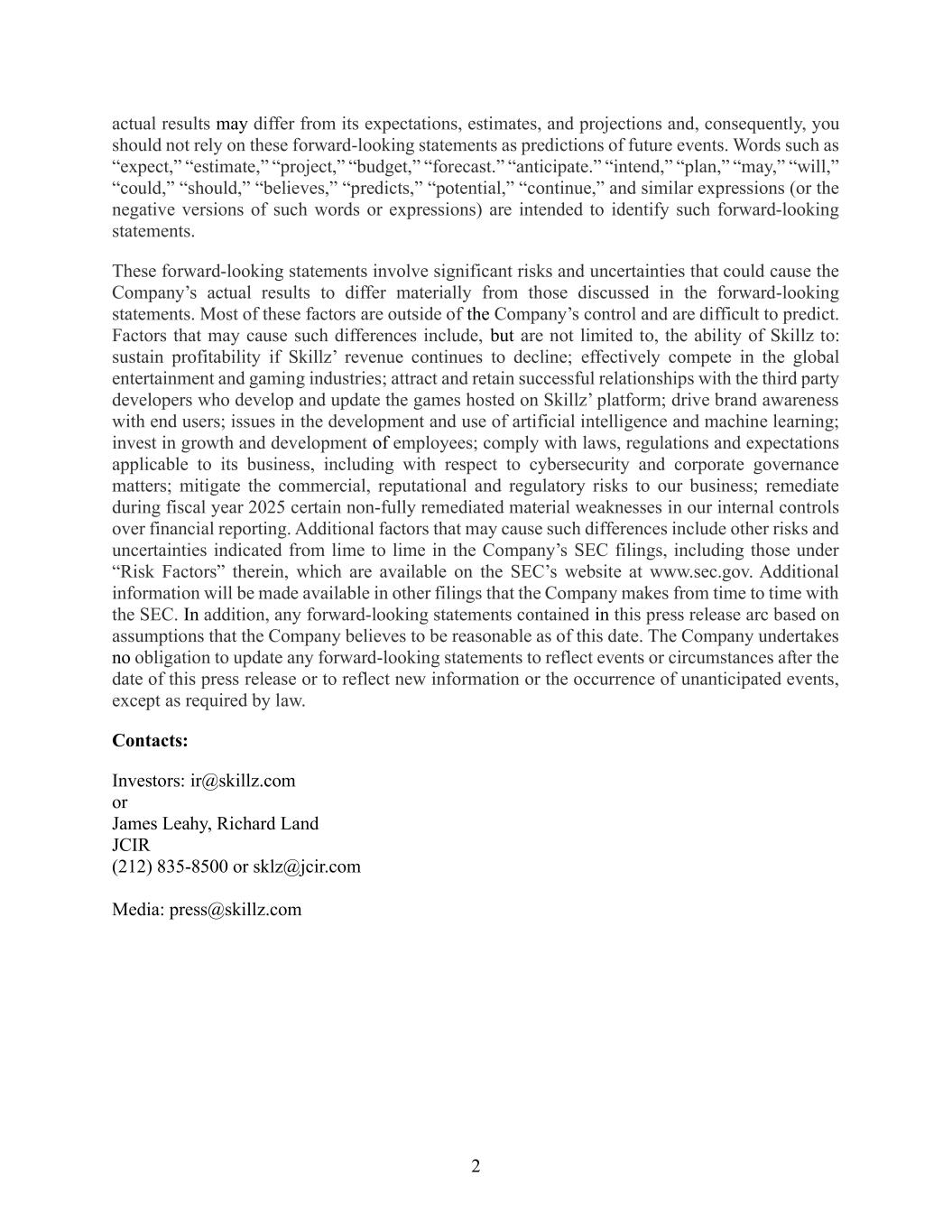 2 actual results may differ from its expectations, estimates, and projections and, consequently, you should not rely on these forward-looking statements as predictions of future events. Words such as “expect,” “estimate,” “project,” “budget,” “forecast.” “anticipate.” “intend,” “plan,” “may,” “will,” “could,” “should,” “believes,” “predicts,” “potential,” “continue,” and similar expressions (or the negative versions of such words or expressions) are intended to identify such forward-looking statements. These forward-looking statements involve significant risks and uncertainties that could cause the Company’s actual results to differ materially from those discussed in the forward-looking statements. Most of these factors are outside of the Company’s control and are difficult to predict. Factors that may cause such differences include, but are not limited to, the ability of Skillz to: sustain profitability if Skillz’ revenue continues to decline; effectively compete in the global entertainment and gaming industries; attract and retain successful relationships with the third party developers who develop and update the games hosted on Skillz’ platform; drive brand awareness with end users; issues in the development and use of artificial intelligence and machine learning; invest in growth and development of employees; comply with laws, regulations and expectations applicable to its business, including with respect to cybersecurity and corporate governance matters; mitigate the commercial, reputational and regulatory risks to our business; remediate during fiscal year 2025 certain non-fully remediated material weaknesses in our internal controls over financial reporting. Additional factors that may cause such differences include other risks and uncertainties indicated from lime to lime in the Company’s SEC filings, including those under “Risk Factors” therein, which are available on the SEC’s website at www.sec.gov. Additional information will be made available in other filings that the Company makes from time to time with the SEC. In addition, any forward-looking statements contained in this press release arc based on assumptions that the Company believes to be reasonable as of this date. The Company undertakes no obligation to update any forward-looking statements to reflect events or circumstances after the date of this press release or to reflect new information or the occurrence of unanticipated events, except as required by law. Contacts: Investors: ir@skillz.com or James Leahy, Richard Land JCIR (212) 835-8500 or sklz@jcir.com Media: press@skillz.com