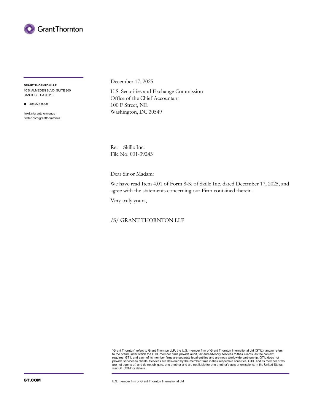 GT.COM U.S. member firm of Grant Thornton International Ltd “Grant Thornton” refers to Grant Thornton LLP, the U.S. member firm of Grant Thornton International Ltd (GTIL), and/or refers to the brand under which the GTIL member firms provide audit, tax and advisory services to their clients, as the context requires. GTIL and each of its member firms are separate legal entities and are not a worldwide partnership. GTIL does not provide services to clients. Services are delivered by the member firms in their respective countries. GTIL and its member firms are not agents of, and do not obligate, one another and are not liable for one another’s acts or omissions. In the United States, visit GT.COM for details. GRANT THORNTON LLP 10 S. ALMEDEN BLVD, SUITE 800 SAN JOSE, CA 95113 D 408 275 9000 linkd.in/grantthorntonus twitter.com/grantthorntonus Re: Skillz Inc. File No. 001-39243 Dear Sir or Madam: We have read Item 4.01 of Form 8-K of Skillz Inc. dated December 17, 2025, and agree with the statements concerning our Firm contained therein. Very truly yours, /S/ GRANT THORNTON LLP December 17, 2025 U.S. Securities and Exchange Commission Office of the Chief Accountant 100 F Street, NE Washington, DC 20549