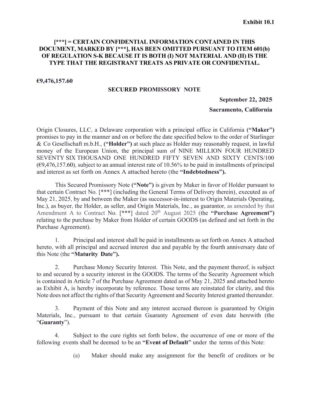 Exhibit 10.1 [***] = CERTAIN CONFIDENTIAL INFORMATION CONTAINED IN THIS DOCUMENT, MARKED BY [***], HAS BEEN OMITTED PURSUANT TO ITEM 601(b) OF REGULATION S-K BECAUSE IT IS BOTH (I) NOT MATERIAL AND (II) IS THE TYPE THAT THE REGISTRANT TREATS AS PRIVATE OR CONFIDENTIAL. €9,476,157.60 SECURED PROMISSORY NOTE September 22, 2025 Sacramento, California Origin Closures, LLC, a Delaware corporation with a principal office in California (“Maker”) promises to pay in the manner and on or before the date specified below to the order of Starlinger & Co Gesellschaft m.b.H., (“Holder”) at such place as Holder may reasonably request, in lawful money of the European Union, the principal sum of NINE MILLION FOUR HUNDRED SEVENTY SIX THOUSAND ONE HUNDRED FIFTY SEVEN AND SIXTY CENTS/100 (€9,476,157.60), subject to an annual interest rate of 10.56% to be paid in installments of principal and interest as set forth on Annex A attached hereto (the “Indebtedness”). This Secured Promissory Note (“Note”) is given by Maker in favor of Holder pursuant to that certain Contract No. [***] (including the General Terms of Delivery therein), executed as of May 21, 2025, by and between the Maker (as successor-in-interest to Origin Materials Operating, Inc.), as buyer, the Holder, as seller, and Origin Materials, Inc., as guarantor, as amended by that Amendment A to Contract No. [***] dated 20th August 2025 (the “Purchase Agreement”) relating to the purchase by Maker from Holder of certain GOODS (as defined and set forth in the Purchase Agreement). 1. Principal and interest shall be paid in installments as set forth on Annex A attached hereto, with all principal and accrued interest due and payable by the fourth anniversary date of this Note (the “Maturity Date”). 2. Purchase Money Security Interest. This Note, and the payment thereof, is subject to and secured by a security interest in the GOODS. The terms of the Security Agreement which is contained in Article 7 of the Purchase Agreement dated as of May 21, 2025 and attached hereto as Exhibit A, is hereby incorporate by reference. Those terms are reinstated for clarity, and this Note does not affect the rights of that Security Agreement and Security Interest granted thereunder. 3. Payment of this Note and any interest accrued thereon is guaranteed by Origin Materials, Inc., pursuant to that certain Guaranty Agreement of even date herewith (the “Guaranty”). 4. Subject to the cure rights set forth below, the occurrence of one or more of the following events shall be deemed to be an “Event of Default” under the terms of this Note: (a) Maker should make any assignment for the benefit of creditors or be