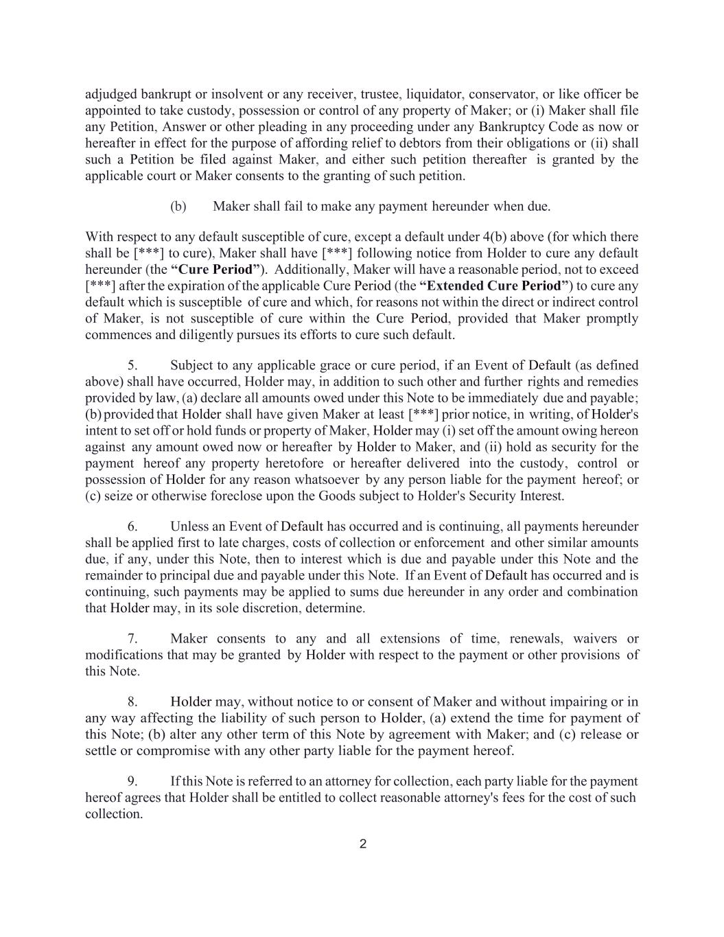 2 adjudged bankrupt or insolvent or any receiver, trustee, liquidator, conservator, or like officer be appointed to take custody, possession or control of any property of Maker; or (i) Maker shall file any Petition, Answer or other pleading in any proceeding under any Bankruptcy Code as now or hereafter in effect for the purpose of affording relief to debtors from their obligations or (ii) shall such a Petition be filed against Maker, and either such petition thereafter is granted by the applicable court or Maker consents to the granting of such petition. (b) Maker shall fail to make any payment hereunder when due. With respect to any default susceptible of cure, except a default under 4(b) above (for which there shall be [***] to cure), Maker shall have [***] following notice from Holder to cure any default hereunder (the “Cure Period”). Additionally, Maker will have a reasonable period, not to exceed [***] after the expiration of the applicable Cure Period (the “Extended Cure Period”) to cure any default which is susceptible of cure and which, for reasons not within the direct or indirect control of Maker, is not susceptible of cure within the Cure Period, provided that Maker promptly commences and diligently pursues its efforts to cure such default. 5. Subject to any applicable grace or cure period, if an Event of Default (as defined above) shall have occurred, Holder may, in addition to such other and further rights and remedies provided by law, (a) declare all amounts owed under this Note to be immediately due and payable; (b) provided that Holder shall have given Maker at least [***] prior notice, in writing, of Holder's intent to set off or hold funds or property of Maker, Holder may (i) set off the amount owing hereon against any amount owed now or hereafter by Holder to Maker, and (ii) hold as security for the payment hereof any property heretofore or hereafter delivered into the custody, control or possession of Holder for any reason whatsoever by any person liable for the payment hereof; or (c) seize or otherwise foreclose upon the Goods subject to Holder's Security Interest. 6. Unless an Event of Default has occurred and is continuing, all payments hereunder shall be applied first to late charges, costs of collection or enforcement and other similar amounts due, if any, under this Note, then to interest which is due and payable under this Note and the remainder to principal due and payable under this Note. If an Event of Default has occurred and is continuing, such payments may be applied to sums due hereunder in any order and combination that Holder may, in its sole discretion, determine. 7. Maker consents to any and all extensions of time, renewals, waivers or modifications that may be granted by Holder with respect to the payment or other provisions of this Note. 8. Holder may, without notice to or consent of Maker and without impairing or in any way affecting the liability of such person to Holder, (a) extend the time for payment of this Note; (b) alter any other term of this Note by agreement with Maker; and (c) release or settle or compromise with any other party liable for the payment hereof. 9. If this Note is referred to an attorney for collection, each party liable for the payment hereof agrees that Holder shall be entitled to collect reasonable attorney's fees for the cost of such collection.