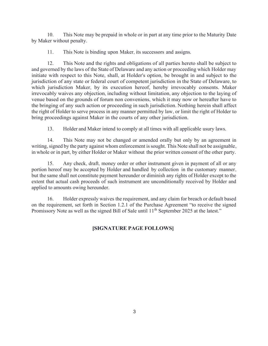 3 10. This Note may be prepaid in whole or in part at any time prior to the Maturity Date by Maker without penalty. 11. This Note is binding upon Maker, its successors and assigns. 12. This Note and the rights and obligations of all parties hereto shall be subject to and governed by the laws of the State of Delaware and any action or proceeding which Holder may initiate with respect to this Note, shall, at Holder's option, be brought in and subject to the jurisdiction of any state or federal court of competent jurisdiction in the State of Delaware, to which jurisdiction Maker, by its execution hereof, hereby irrevocably consents. Maker irrevocably waives any objection, including without limitation, any objection to the laying of venue based on the grounds of forum non conveniens, which it may now or hereafter have to the bringing of any such action or proceeding in such jurisdiction. Nothing herein shall affect the right of Holder to serve process in any manner permitted by law, or limit the right of Holder to bring proceedings against Maker in the courts of any other jurisdiction. 13. Holder and Maker intend to comply at all times with all applicable usury laws. 14. This Note may not be changed or amended orally but only by an agreement in writing, signed by the party against whom enforcement is sought. This Note shall not be assignable, in whole or in part, by either Holder or Maker without the prior written consent of the other party. 15. Any check, draft, money order or other instrument given in payment of all or any portion hereof may be accepted by Holder and handled by collection in the customary manner, but the same shall not constitute payment hereunder or diminish any rights of Holder except to the extent that actual cash proceeds of such instrument are unconditionally received by Holder and applied to amounts owing hereunder. 16. Holder expressly waives the requirement, and any claim for breach or default based on the requirement, set forth in Section 1.2.1 of the Purchase Agreement “to receive the signed Promissory Note as well as the signed Bill of Sale until 11th September 2025 at the latest.” [SIGNATURE PAGE FOLLOWS]