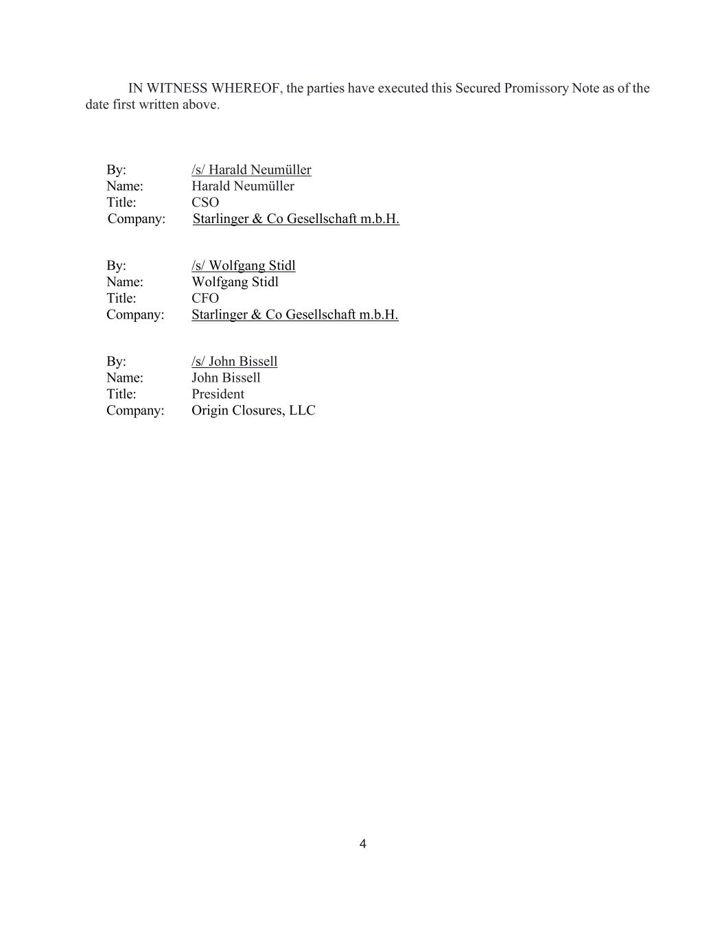 4 IN WITNESS WHEREOF, the parties have executed this Secured Promissory Note as of the date first written above. By: /s/ Harald Neumüller Name: Harald Neumüller Title: CSO Company: Starlinger & Co Gesellschaft m.b.H. By: /s/ Wolfgang Stidl Name: Wolfgang Stidl Title: CFO Company: Starlinger & Co Gesellschaft m.b.H. By: /s/ John Bissell Name: John Bissell Title: President Company: Origin Closures, LLC