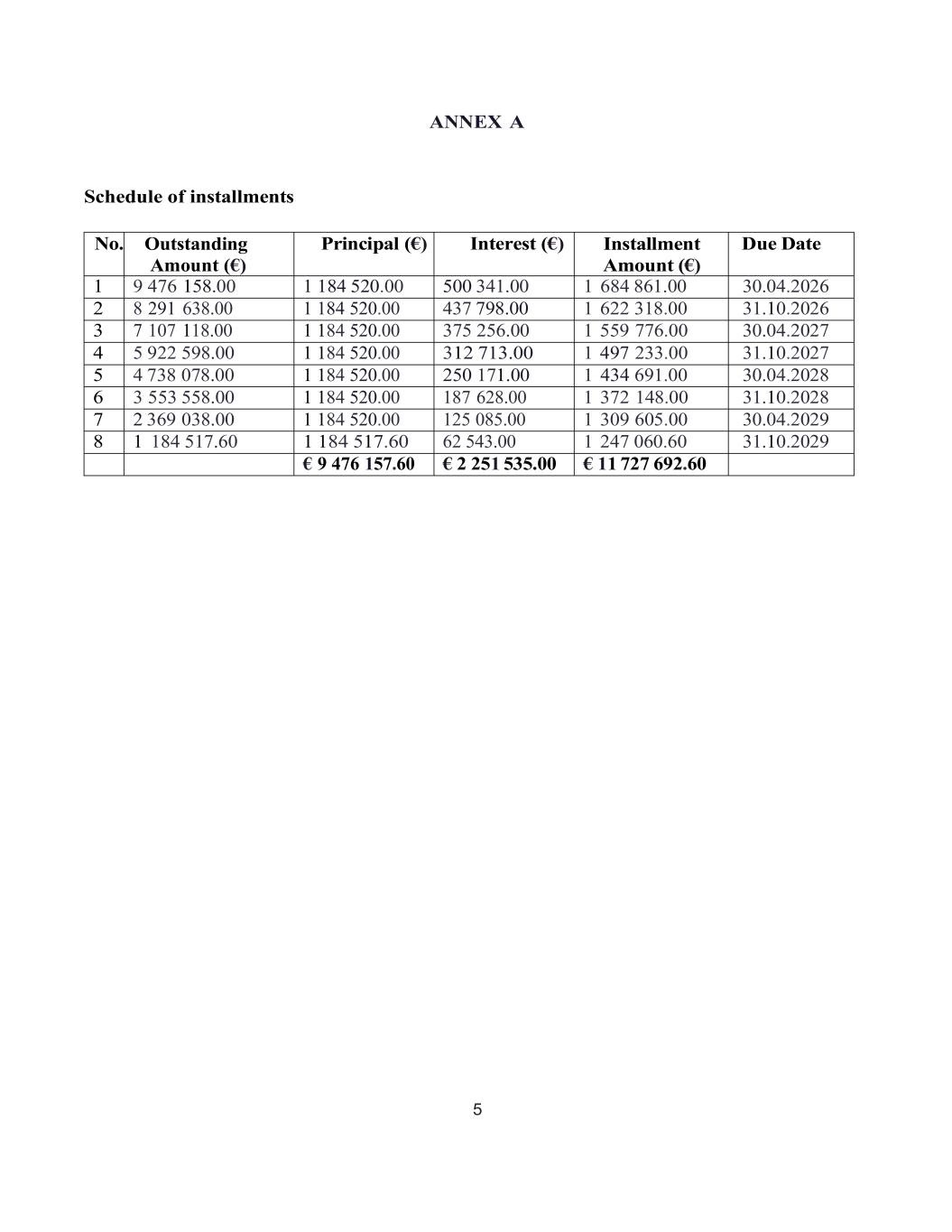 5 ANNEX A Schedule of installments No. Outstanding Amount (€) Principal (€) Interest (€) Installment Amount (€) Due Date 1 9 476 158.00 1 184 520.00 500 341.00 1 684 861.00 30.04.2026 2 8 291 638.00 1 184 520.00 437 798.00 1 622 318.00 31.10.2026 3 7 107 118.00 1 184 520.00 375 256.00 1 559 776.00 30.04.2027 4 5 922 598.00 1 184 520.00 312 713.00 1 497 233.00 31.10.2027 5 4 738 078.00 1 184 520.00 250 171.00 1 434 691.00 30.04.2028 6 3 553 558.00 1 184 520.00 187 628.00 1 372 148.00 31.10.2028 7 2 369 038.00 1 184 520.00 125 085.00 1 309 605.00 30.04.2029 8 1 184 517.60 1 184 517.60 62 543.00 1 247 060.60 31.10.2029 € 9 476 157.60 € 2 251 535.00 € 11 727 692.60