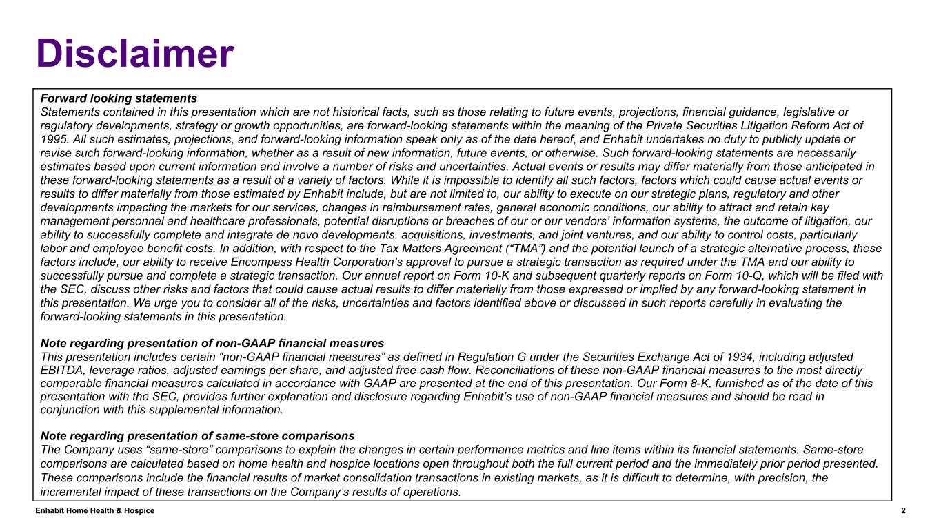 Enhabit Home Health & Hospice 2 Disclaimer Forward looking statements Statements contained in this presentation which are not historical facts, such as those relating to future events, projections, financial guidance, legislative or regulatory developments, strategy or growth opportunities, are forward-looking statements within the meaning of the Private Securities Litigation Reform Act of 1995. All such estimates, projections, and forward-looking information speak only as of the date hereof, and Enhabit undertakes no duty to publicly update or revise such forward-looking information, whether as a result of new information, future events, or otherwise. Such forward-looking statements are necessarily estimates based upon current information and involve a number of risks and uncertainties. Actual events or results may differ materially from those anticipated in these forward-looking statements as a result of a variety of factors. While it is impossible to identify all such factors, factors which could cause actual events or results to differ materially from those estimated by Enhabit include, but are not limited to, our ability to execute on our strategic plans, regulatory and other developments impacting the markets for our services, changes in reimbursement rates, general economic conditions, our ability to attract and retain key management personnel and healthcare professionals, potential disruptions or breaches of our or our vendors’ information systems, the outcome of litigation, our ability to successfully complete and integrate de novo developments, acquisitions, investments, and joint ventures, and our ability to control costs, particularly labor and employee benefit costs. In addition, with respect to the Tax Matters Agreement (“TMA”) and the potential launch of a strategic alternative process, these factors include, our ability to receive Encompass Health Corporation’s approval to pursue a strategic transaction as required under the TMA and our ability to successfully pursue and complete a strategic transaction. Our annual report on Form 10-K and subsequent quarterly reports on Form 10-Q, which will be filed with the SEC, discuss other risks and factors that could cause actual results to differ materially from those expressed or implied by any forward-looking statement in this presentation. We urge you to consider all of the risks, uncertainties and factors identified above or discussed in such reports carefully in evaluating the forward-looking statements in this presentation. Note regarding presentation of non-GAAP financial measures This presentation includes certain “non-GAAP financial measures” as defined in Regulation G under the Securities Exchange Act of 1934, including adjusted EBITDA, leverage ratios, adjusted earnings per share, and adjusted free cash flow. Reconciliations of these non-GAAP financial measures to the most directly comparable financial measures calculated in accordance with GAAP are presented at the end of this presentation. Our Form 8-K, furnished as of the date of this presentation with the SEC, provides further explanation and disclosure regarding Enhabit’s use of non-GAAP financial measures and should be read in conjunction with this supplemental information. Note regarding presentation of same-store comparisons The Company uses “same-store” comparisons to explain the changes in certain performance metrics and line items within its financial statements. Same-store comparisons are calculated based on home health and hospice locations open throughout both the full current period and the immediately prior period presented. These comparisons include the financial results of market consolidation transactions in existing markets, as it is difficult to determine, with precision, the incremental impact of these transactions on the Company’s results of operations.