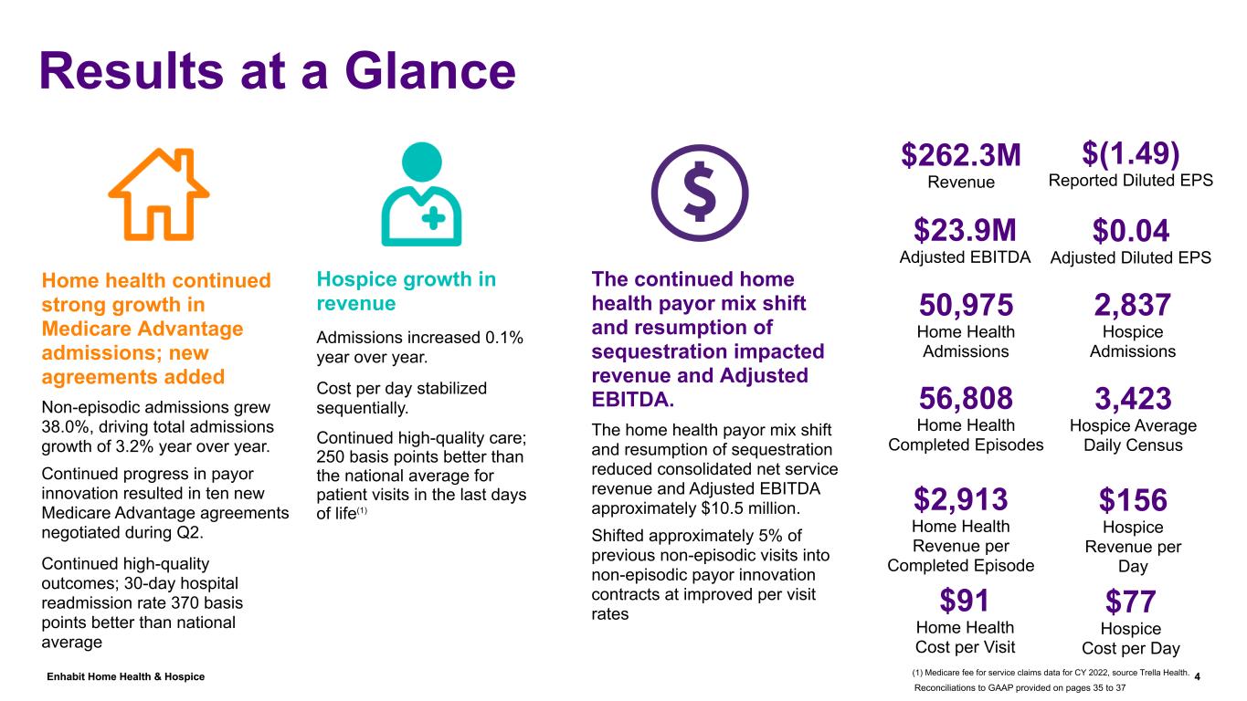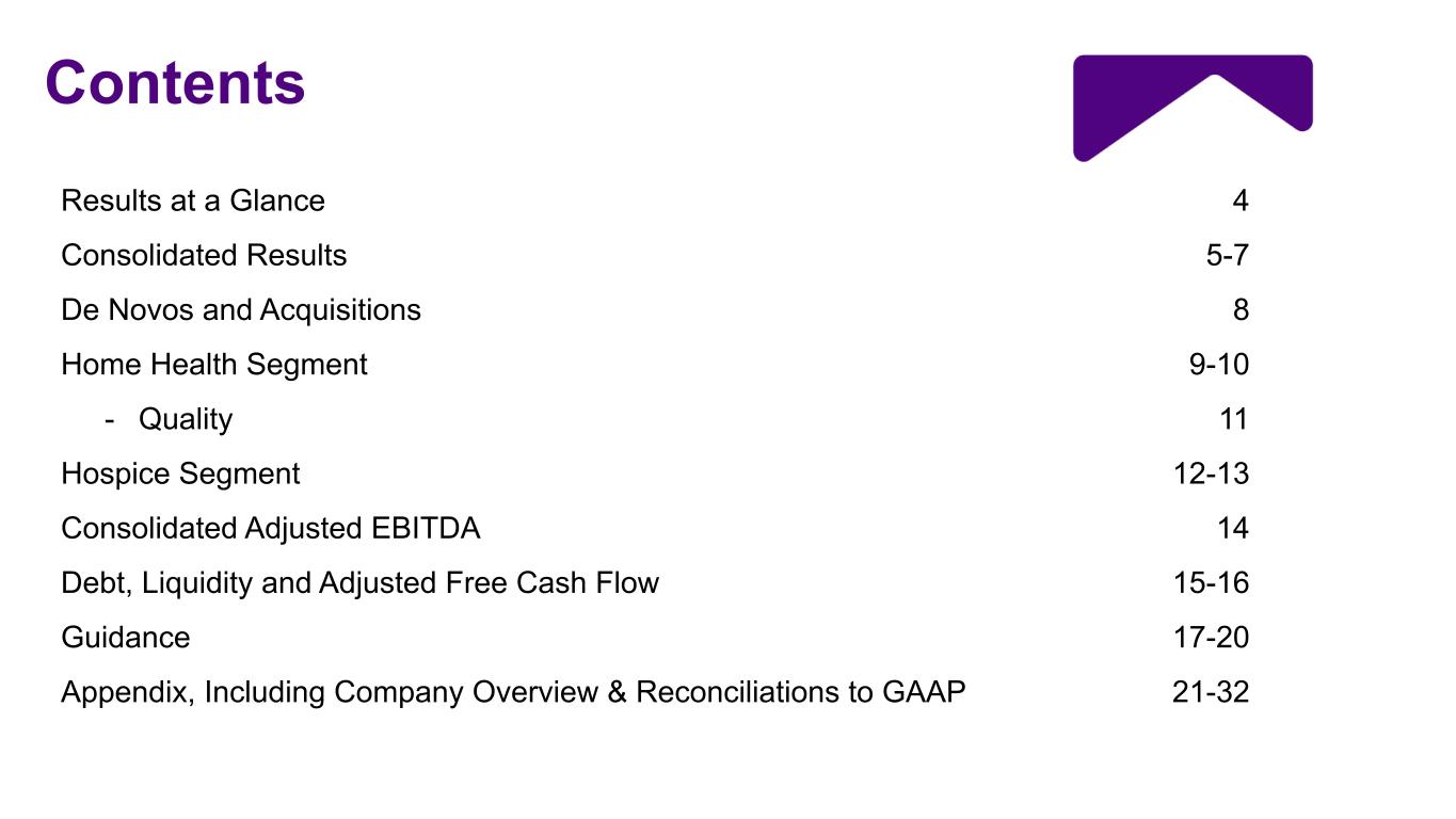 Contents Results at a Glance 4 Consolidated Results 5-7 De Novos and Acquisitions 8 Home Health Segment 9-10 - Quality 11 Hospice Segment 12-13 Consolidated Adjusted EBITDA 14 Debt, Liquidity and Adjusted Free Cash Flow 15-16 Guidance 17-20 Appendix, Including Company Overview & Reconciliations to GAAP 21-32