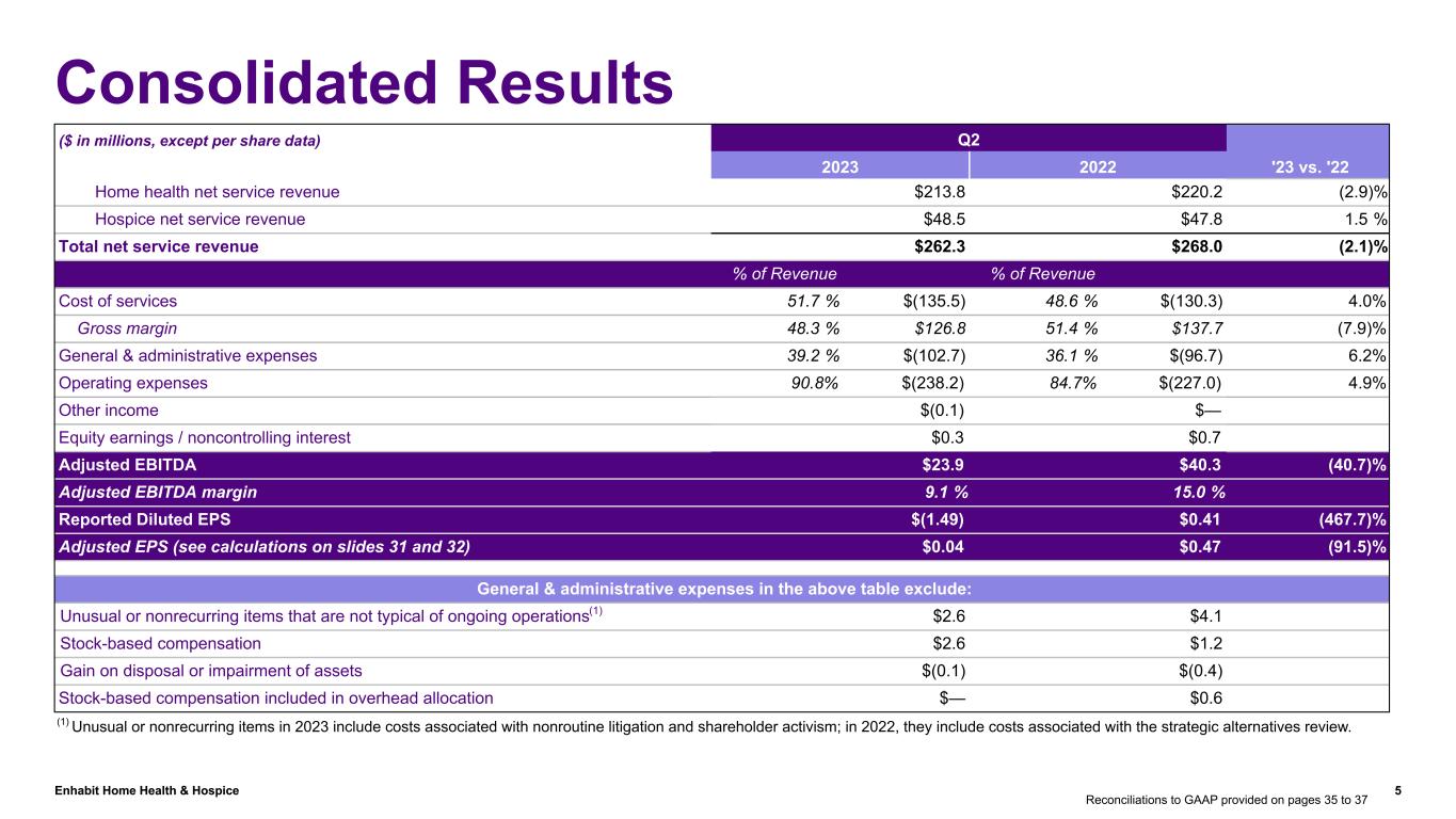 Enhabit Home Health & Hospice 4 Home health continued strong growth in Medicare Advantage admissions; new agreements added Non-episodic admissions grew 38.0%, driving total admissions growth of 3.2% year over year. Continued progress in payor innovation resulted in ten new Medicare Advantage agreements negotiated during Q2. Continued high-quality outcomes; 30-day hospital readmission rate 370 basis points better than national average $262.3M Revenue $23.9M Adjusted EBITDA 50,975 Home Health Admissions 2,837 Hospice Admissions 56,808 Home Health Completed Episodes 3,423 Hospice Average Daily Census Hospice growth in revenue Admissions increased 0.1% year over year. Cost per day stabilized sequentially. Continued high-quality care; 250 basis points better than the national average for patient visits in the last days of life(1) $2,913 Home Health Revenue per Completed Episode $156 Hospice Revenue per Day $91 Home Health Cost per Visit $77 Hospice Cost per Day Reconciliations to GAAP provided on pages 35 to 37 Results at a Glance The continued home health payor mix shift and resumption of sequestration impacted revenue and Adjusted EBITDA. The home health payor mix shift and resumption of sequestration reduced consolidated net service revenue and Adjusted EBITDA approximately $10.5 million. Shifted approximately 5% of previous non-episodic visits into non-episodic payor innovation contracts at improved per visit rates $(1.49) Reported Diluted EPS $0.04 Adjusted Diluted EPS (1) Medicare fee for service claims data for CY 2022, source Trella Health.