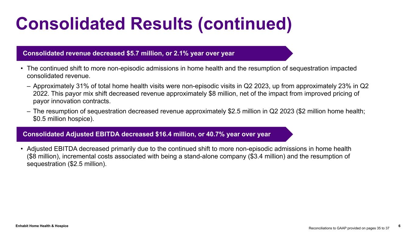 Enhabit Home Health & Hospice 5 Consolidated Results ($ in millions, except per share data) Q2 '23 vs. '222023 2022 Home health net service revenue $213.8 $220.2 (2.9) % Hospice net service revenue $48.5 $47.8 1.5 % Total net service revenue $262.3 $268.0 (2.1) % % of Revenue % of Revenue Cost of services 51.7 % $(135.5) 48.6 % $(130.3) 4.0 % Gross margin 48.3 % $126.8 51.4 % $137.7 (7.9) % General & administrative expenses 39.2 % $(102.7) 36.1 % $(96.7) 6.2 % Operating expenses 90.8 % $(238.2) 84.7 % $(227.0) 4.9 % Other income $(0.1) $— Equity earnings / noncontrolling interest $0.3 $0.7 Adjusted EBITDA $23.9 $40.3 (40.7) % Adjusted EBITDA margin 9.1 % 15.0 % Reported Diluted EPS $(1.49) $0.41 (467.7) % Adjusted EPS (see calculations on slides 31 and 32) $0.04 $0.47 (91.5) % General & administrative expenses in the above table exclude: Unusual or nonrecurring items that are not typical of ongoing operations(1) $2.6 $4.1 Stock-based compensation $2.6 $1.2 Gain on disposal or impairment of assets $(0.1) $(0.4) Stock-based compensation included in overhead allocation $— $0.6 Reconciliations to GAAP provided on pages 35 to 37 (1) Unusual or nonrecurring items in 2023 include costs associated with nonroutine litigation and shareholder activism; in 2022, they include costs associated with the strategic alternatives review.