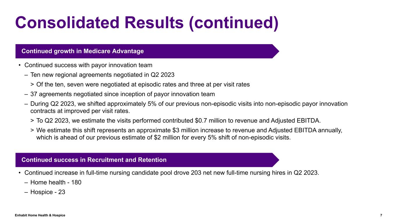 Enhabit Home Health & Hospice 6 Consolidated Results (continued) • The continued shift to more non-episodic admissions in home health and the resumption of sequestration impacted consolidated revenue. – Approximately 31% of total home health visits were non-episodic visits in Q2 2023, up from approximately 23% in Q2 2022. This payor mix shift decreased revenue approximately $8 million, net of the impact from improved pricing of payor innovation contracts. – The resumption of sequestration decreased revenue approximately $2.5 million in Q2 2023 ($2 million home health; $0.5 million hospice). Consolidated Adjusted EBITDA decreased $16.4 million, or 40.7% year over year Consolidated revenue decreased $5.7 million, or 2.1% year over year Reconciliations to GAAP provided on pages 35 to 37 • Adjusted EBITDA decreased primarily due to the continued shift to more non-episodic admissions in home health ($8 million), incremental costs associated with being a stand-alone company ($3.4 million) and the resumption of sequestration ($2.5 million).