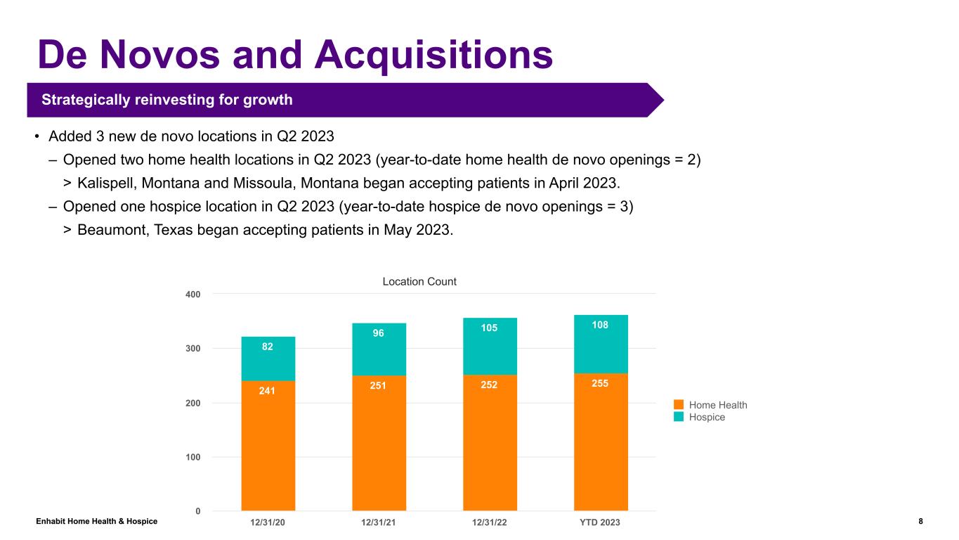 Enhabit Home Health & Hospice 7 Consolidated Results (continued) Continued growth in Medicare Advantage Continued success in Recruitment and Retention • Continued increase in full-time nursing candidate pool drove 203 net new full-time nursing hires in Q2 2023. – Home health - 180 – Hospice - 23 • Continued success with payor innovation team – Ten new regional agreements negotiated in Q2 2023 > Of the ten, seven were negotiated at episodic rates and three at per visit rates – 37 agreements negotiated since inception of payor innovation team – During Q2 2023, we shifted approximately 5% of our previous non-episodic visits into non-episodic payor innovation contracts at improved per visit rates. > To Q2 2023, we estimate the visits performed contributed $0.7 million to revenue and Adjusted EBITDA. > We estimate this shift represents an approximate $3 million increase to revenue and Adjusted EBITDA annually, which is ahead of our previous estimate of $2 million for every 5% shift of non-episodic visits.