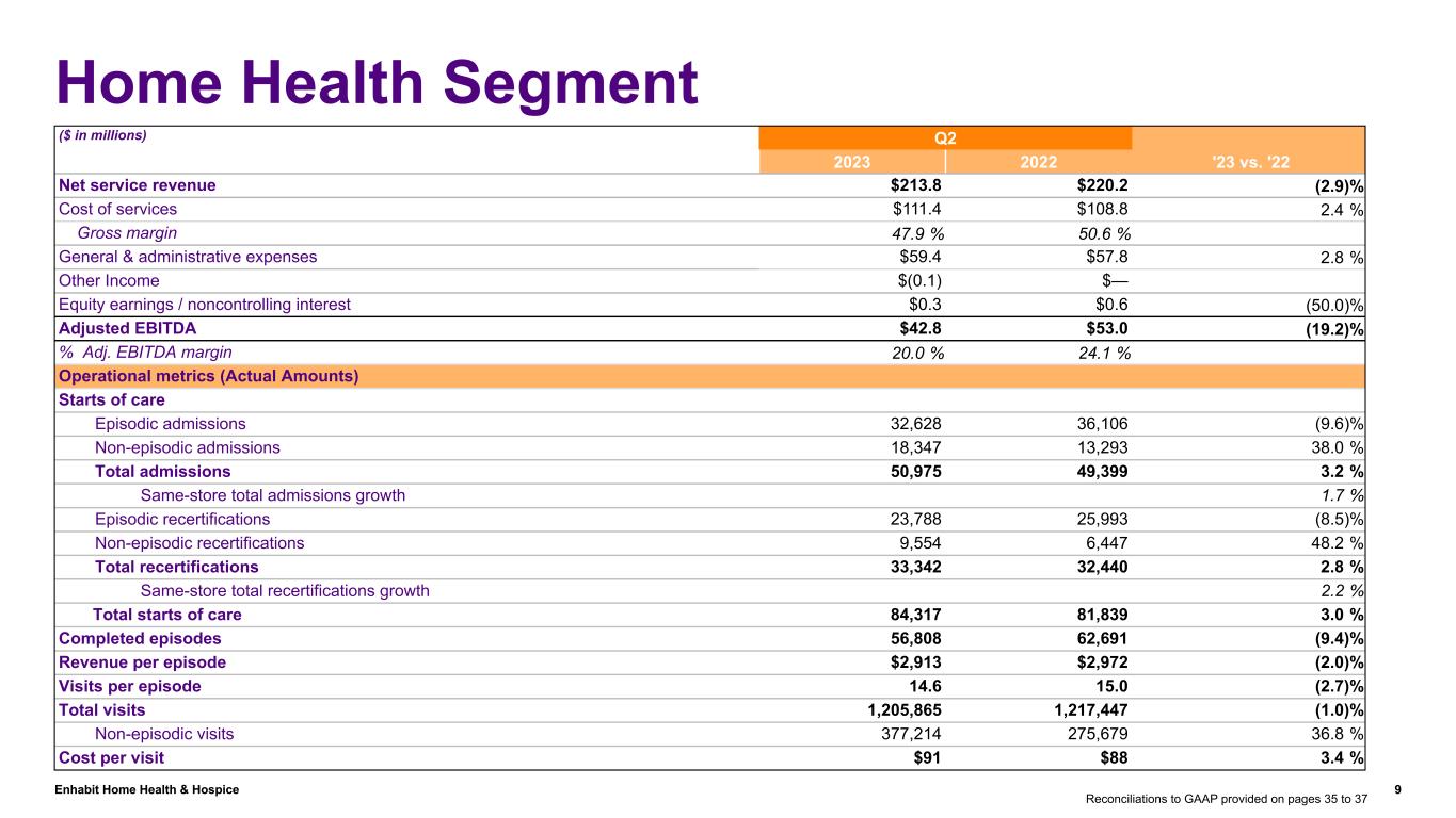 Enhabit Home Health & Hospice 8 De Novos and Acquisitions Strategically reinvesting for growth • Added 3 new de novo locations in Q2 2023 – Opened two home health locations in Q2 2023 (year-to-date home health de novo openings = 2) > Kalispell, Montana and Missoula, Montana began accepting patients in April 2023. – Opened one hospice location in Q2 2023 (year-to-date hospice de novo openings = 3) > Beaumont, Texas began accepting patients in May 2023. Home Health Hospice Total December 31, 2020 241 82 323 De Novo Locations Opened 0 3 3 Acquired Locations 11 11 22 Merged/Closed Locations (1) 0 (1) December 31, 2021 251 96 347 De Novo Locations Opened 1 3 4 Acquired Locations 2 6 8 Merged/Closed Locations (2) 0 (2) December 31, 2022 252 105 357 De Novo Locations Opened 2 3 5 Acquired Locations 1 0 1 YTD 2023 255 108 363 241 251 252 255 82 96 105 108 Home Health Hospice 12/31/20 12/31/21 12/31/22 YTD 2023 0 100 200 300 400 Location Count