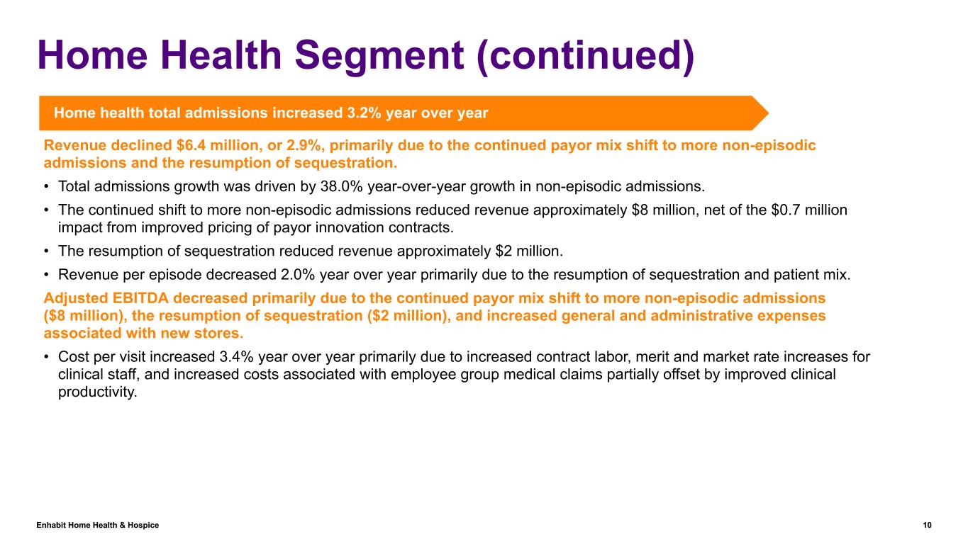 Enhabit Home Health & Hospice 9 Home Health Segment ($ in millions) Q2 '23 vs. '222023 2022 Net service revenue $213.8 $220.2 (2.9) % Cost of services $111.4 $108.8 2.4 % Gross margin 47.9 % 50.6 % General & administrative expenses $59.4 $57.8 2.8 % Other Income $(0.1) $— Equity earnings / noncontrolling interest $0.3 $0.6 (50.0) % Adjusted EBITDA $42.8 $53.0 (19.2) % % Adj. EBITDA margin 20.0 % 24.1 % Operational metrics (Actual Amounts) Starts of care Episodic admissions 32,628 36,106 (9.6) % Non-episodic admissions 18,347 13,293 38.0 % Total admissions 50,975 49,399 3.2 % Same-store total admissions growth 1.7 % Episodic recertifications 23,788 25,993 (8.5) % Non-episodic recertifications 9,554 6,447 48.2 % Total recertifications 33,342 32,440 2.8 % Same-store total recertifications growth 2.2 % Total starts of care 84,317 81,839 3.0 % Completed episodes 56,808 62,691 (9.4) % Revenue per episode $2,913 $2,972 (2.0) % Visits per episode 14.6 15.0 (2.7) % Total visits 1,205,865 1,217,447 (1.0) % Non-episodic visits 377,214 275,679 36.8 % Cost per visit $91 $88 3.4 % Reconciliations to GAAP provided on pages 35 to 37