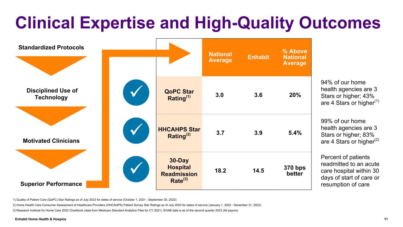 Enhabit Home Health & Hospice 10 Home Health Segment (continued) Revenue declined $6.4 million, or 2.9%, primarily due to the continued payor mix shift to more non-episodic admissions and the resumption of sequestration. • Total admissions growth was driven by 38.0% year-over-year growth in non-episodic admissions. • The continued shift to more non-episodic admissions reduced revenue approximately $8 million, net of the $0.7 million impact from improved pricing of payor innovation contracts. • The resumption of sequestration reduced revenue approximately $2 million. • Revenue per episode decreased 2.0% year over year primarily due to the resumption of sequestration and patient mix. Adjusted EBITDA decreased primarily due to the continued payor mix shift to more non-episodic admissions ($8 million), the resumption of sequestration ($2 million), and increased general and administrative expenses associated with new stores. • Cost per visit increased 3.4% year over year primarily due to increased contract labor, merit and market rate increases for clinical staff, and increased costs associated with employee group medical claims partially offset by improved clinical productivity. Home health total admissions increased 3.2% year over year