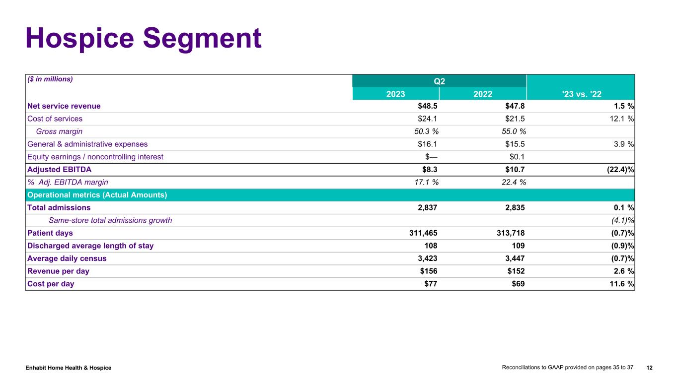 Enhabit Home Health & Hospice 11 Clinical Expertise and High-Quality Outcomes National Average Enhabit % Above National Average QoPC Star Rating(1) 3.0. 3.6 20% HHCAHPS Star Rating(2) 3.7 3.9 5.4% 30-Day Hospital Readmission Rate(3) 18.2 14.5 370 bps better Standardized Protocols Motivated Clinicians Disciplined Use of Technology Superior Performance 94% of our home health agencies are 3 Stars or higher; 43% are 4 Stars or higher(1) 99% of our home health agencies are 3 Stars or higher; 83% are 4 Stars or higher(2) Percent of patients readmitted to an acute care hospital within 30 days of start of care or resumption of care 1) Quality of Patient Care (QoPC) Star Ratings as of July 2023 for dates of service (October 1, 2021 - September 30, 2022) 2) Home Health Care Consumer Assessment of Healthcare Providers (HHCAHPS) Patient Survey Star Ratings as of July 2023 for dates of service (January 1, 2022 - December 31, 2022) 3) Research Institute for Home Care 2022 Chartbook (data from Medicare Standard Analytics Files for CY 2021), EHAB data is as of the second quarter 2023 (All payors)