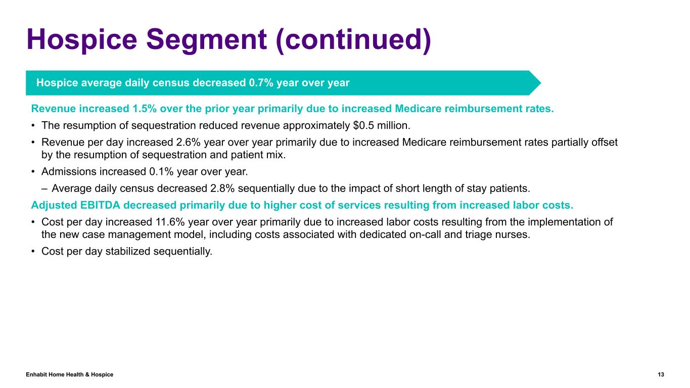 Enhabit Home Health & Hospice 12 Hospice Segment ($ in millions) Q2 '23 vs. '222023 2022 Net service revenue $48.5 $47.8 1.5 % Cost of services $24.1 $21.5 12.1 % Gross margin 50.3 % 55.0 % General & administrative expenses $16.1 $15.5 3.9 % Equity earnings / noncontrolling interest $— $0.1 Adjusted EBITDA $8.3 $10.7 (22.4) % % Adj. EBITDA margin 17.1 % 22.4 % Operational metrics (Actual Amounts) Total admissions 2,837 2,835 0.1 % Same-store total admissions growth (4.1) % Patient days 311,465 313,718 (0.7) % Discharged average length of stay 108 109 (0.9) % Average daily census 3,423 3,447 (0.7) % Revenue per day $156 $152 2.6 % Cost per day $77 $69 11.6 % Reconciliations to GAAP provided on pages 35 to 37