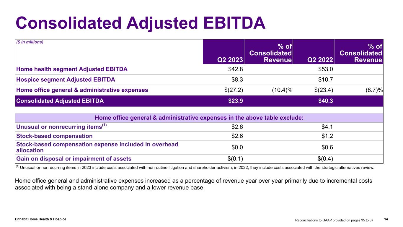 Enhabit Home Health & Hospice 13 Hospice Segment (continued) Hospice average daily census decreased 0.7% year over year Revenue increased 1.5% over the prior year primarily due to increased Medicare reimbursement rates. • The resumption of sequestration reduced revenue approximately $0.5 million. • Revenue per day increased 2.6% year over year primarily due to increased Medicare reimbursement rates partially offset by the resumption of sequestration and patient mix. • Admissions increased 0.1% year over year. – Average daily census decreased 2.8% sequentially due to the impact of short length of stay patients. Adjusted EBITDA decreased primarily due to higher cost of services resulting from increased labor costs. • Cost per day increased 11.6% year over year primarily due to increased labor costs resulting from the implementation of the new case management model, including costs associated with dedicated on-call and triage nurses. • Cost per day stabilized sequentially.