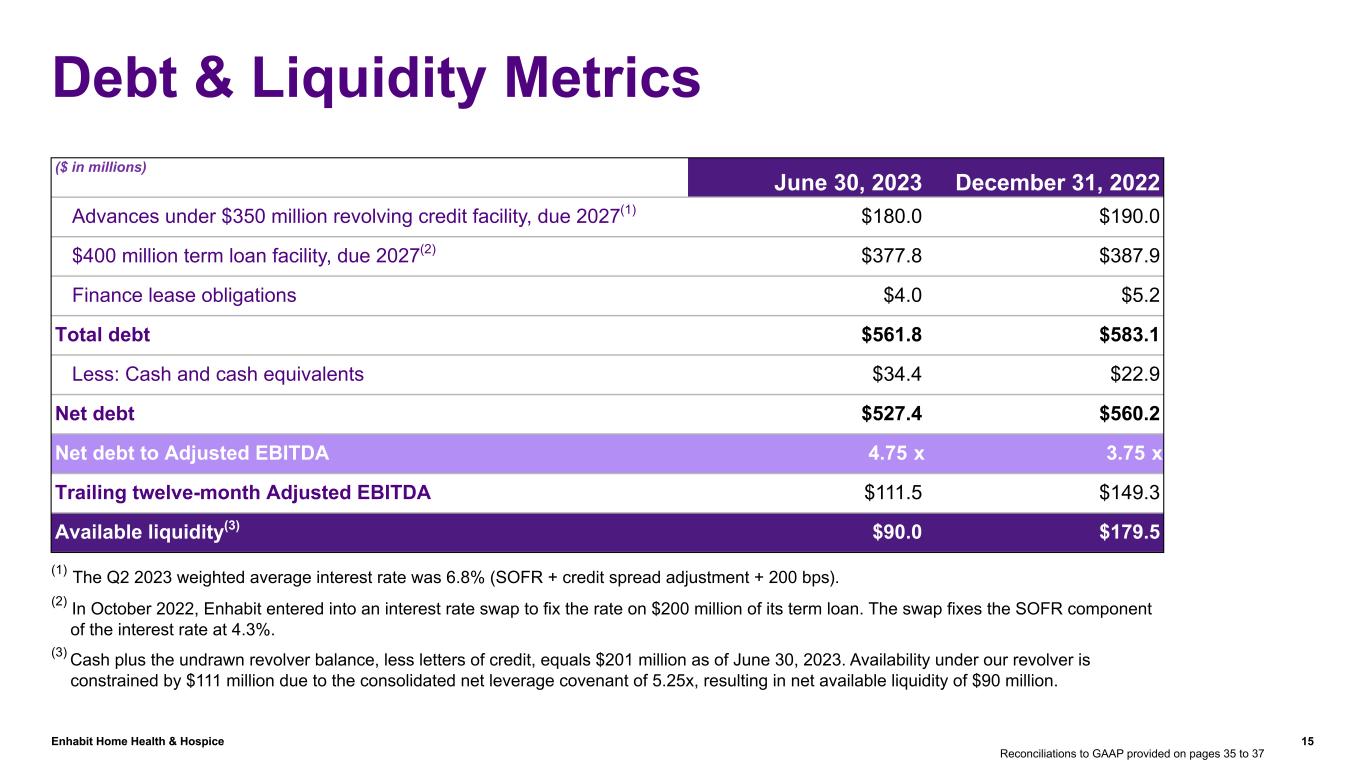 Enhabit Home Health & Hospice 14 Consolidated Adjusted EBITDA ($ in millions) Q2 2023 % of Consolidated Revenue Q2 2022 % of Consolidated Revenue Home health segment Adjusted EBITDA $42.8 $53.0 Hospice segment Adjusted EBITDA $8.3 $10.7 Home office general & administrative expenses $(27.2) (10.4) % $(23.4) (8.7) % Consolidated Adjusted EBITDA $23.9 $40.3 Home office general & administrative expenses in the above table exclude: Unusual or nonrecurring items(1) $2.6 $4.1 Stock-based compensation $2.6 $1.2 Stock-based compensation expense included in overhead allocation $0.0 $0.6 Gain on disposal or impairment of assets $(0.1) $(0.4) Home office general and administrative expenses increased as a percentage of revenue year over year primarily due to incremental costs associated with being a stand-alone company and a lower revenue base. Reconciliations to GAAP provided on pages 35 to 37 (1) Unusual or nonrecurring items in 2023 include costs associated with nonroutine litigation and shareholder activism; in 2022, they include costs associated with the strategic alternatives review.
