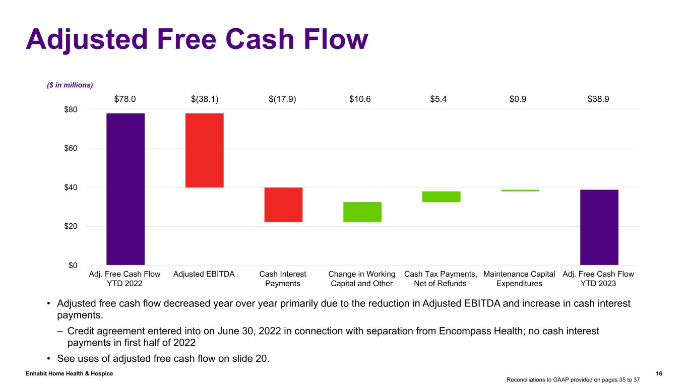 Enhabit Home Health & Hospice 15 Debt & Liquidity Metrics ($ in millions) June 30, 2023 December 31, 2022 Advances under $350 million revolving credit facility, due 2027(1) $180.0 $190.0 $400 million term loan facility, due 2027(2) $377.8 $387.9 Finance lease obligations $4.0 $5.2 Total debt $561.8 $583.1 Less: Cash and cash equivalents $34.4 $22.9 Net debt $527.4 $560.2 Net debt to Adjusted EBITDA 4.75 x 3.75 x Trailing twelve-month Adjusted EBITDA $111.5 $149.3 Available liquidity(3) $90.0 $179.5 Reconciliations to GAAP provided on pages 35 to 37 (1) The Q2 2023 weighted average interest rate was 6.8% (SOFR + credit spread adjustment + 200 bps). (2) In October 2022, Enhabit entered into an interest rate swap to fix the rate on $200 million of its term loan. The swap fixes the SOFR component of the interest rate at 4.3%. (3) Cash plus the undrawn revolver balance, less letters of credit, equals $201 million as of June 30, 2023. Availability under our revolver is constrained by $111 million due to the consolidated net leverage covenant of 5.25x, resulting in net available liquidity of $90 million.