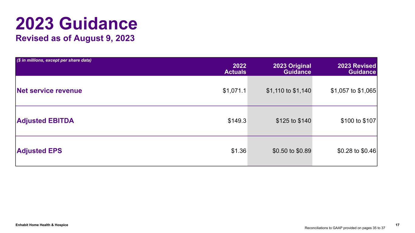 Enhabit Home Health & Hospice 16 Adjusted Free Cash Flow • Adjusted free cash flow decreased year over year primarily due to the reduction in Adjusted EBITDA and increase in cash interest payments. – Credit agreement entered into on June 30, 2022 in connection with separation from Encompass Health; no cash interest payments in first half of 2022 • See uses of adjusted free cash flow on slide 20. ($ in millions) $78.0 $(38.1) $10.6$(17.9) $5.4 $0.9 $38.9 Adj. Free Cash Flow YTD 2022 Adjusted EBITDA Cash Interest Payments Change in Working Capital and Other Cash Tax Payments, Net of Refunds Maintenance Capital Expenditures Adj. Free Cash Flow YTD 2023 $0 $20 $40 $60 $80 Reconciliations to GAAP provided on pages 35 to 37