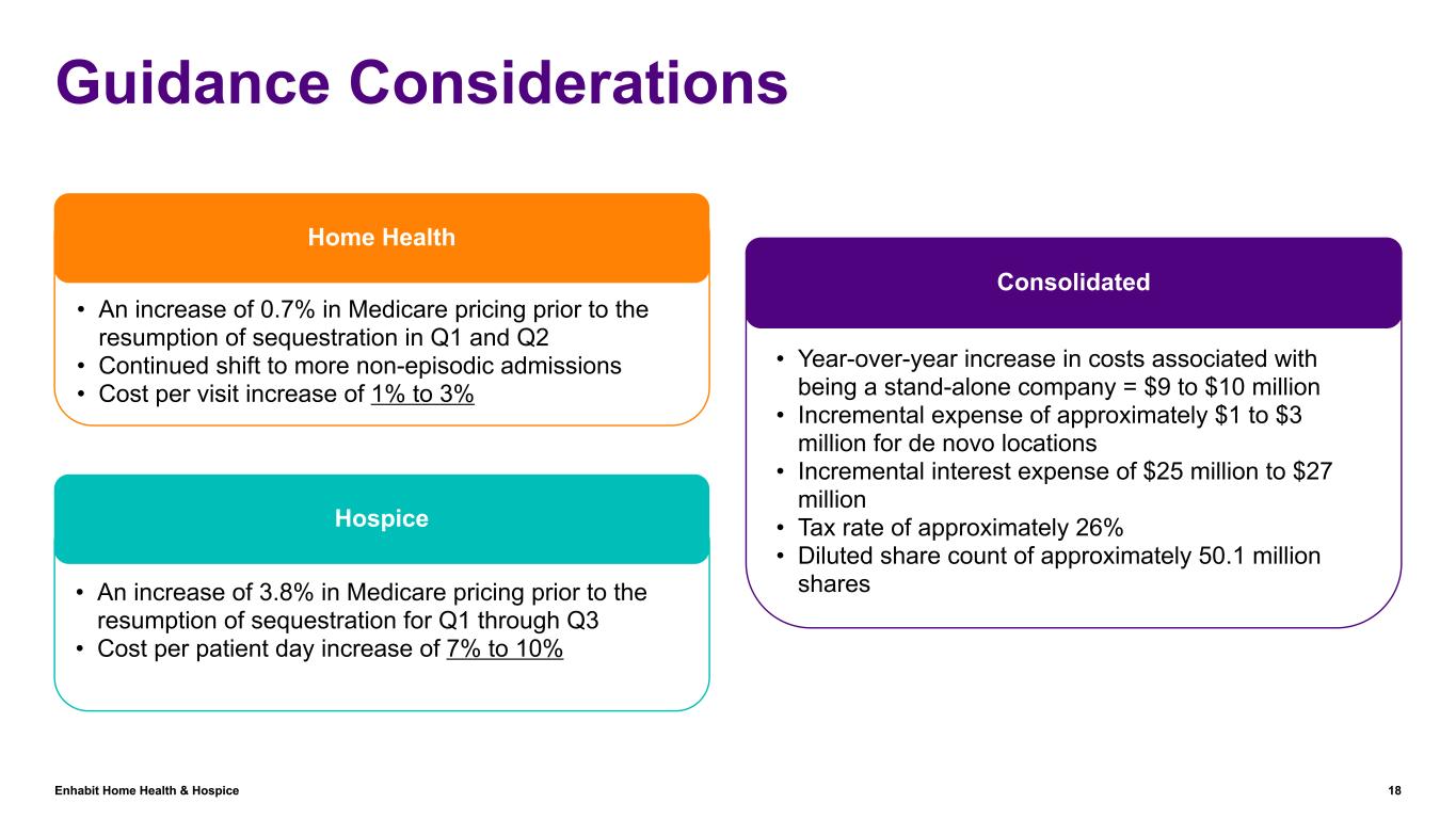 Enhabit Home Health & Hospice 17 2023 Guidance Revised as of August 9, 2023 Reconciliations to GAAP provided on pages 35 to 37 ($ in millions, except per share data) 2022 Actuals 2023 Original Guidance 2023 Revised Guidance Net service revenue $1,071.1 $1,110 to $1,140 $1,057 to $1,065 Adjusted EBITDA $149.3 $125 to $140 $100 to $107 Adjusted EPS $1.36 $0.50 to $0.89 $0.28 to $0.46