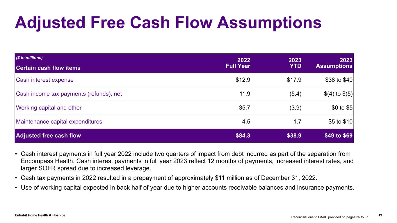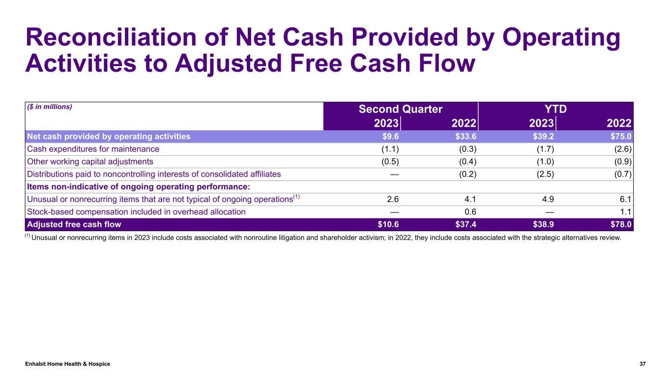 Enhabit Home Health & Hospice 36 Reconciliation of Cash Provided by Operations to Adjusted EBITDA ($ in millions) Second Quarter YTD 2023 2022 2023 2022 Net cash provided by operating activities $9.6 $33.6 $39.2 $75.0 Interest expense, excluding amortization of debt discounts and fees 10.1 0.1 19.3 0.1 Unusual or nonrecurring items that are not typical of ongoing operations(1) 2.6 4.1 4.9 6.1 Change in assets and liabilities, excluding derivative instruments 1.2 (5.0) (15.0) (10.3) Current portion of income tax expense 0.7 7.6 1.9 16.5 Net income attributable to noncontrolling interests in continuing operations (0.3) (0.7) (0.8) (1.3) Stock-based compensation included in overhead allocation — 0.6 — 1.1 Other — — (0.3) 0.1 Adjusted EBITDA $23.9 $40.3 $49.2 $87.3 (1) Unusual or nonrecurring items in 2023 include costs associated with nonroutine litigation and shareholder activism; in 2022, they include costs associated with the strategic alternatives review.