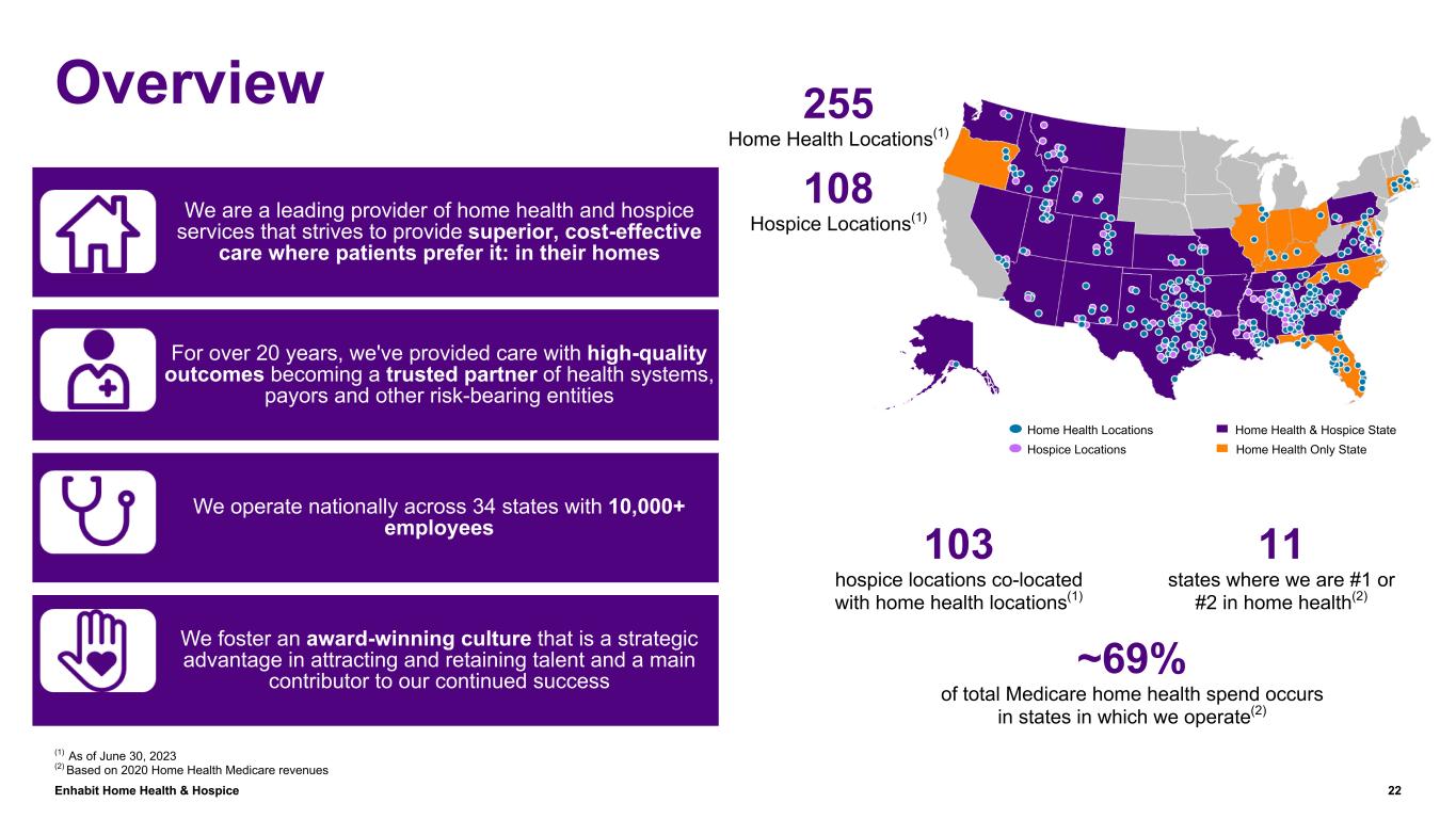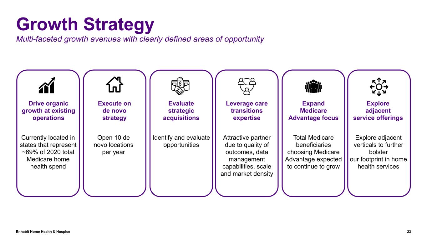 Enhabit Home Health & Hospice 22 Overview 103 hospice locations co-located with home health locations(1) 11 states where we are #1 or #2 in home health(2) ~69% of total Medicare home health spend occurs in states in which we operate(2) Home Health Locations Hospice Locations Home Health & Hospice State Home Health Only State (1) As of June 30, 2023 (2) Based on 2020 Home Health Medicare revenues 108 Hospice Locations(1) 255 Home Health Locations(1) We are a leading provider of home health and hospice services that strives to provide superior, cost-effective care where patients prefer it: in their homes For over 20 years, we've provided care with high-quality outcomes becoming a trusted partner of health systems, payors and other risk-bearing entities We operate nationally across 34 states with 10,000+ employees We foster an award-winning culture that is a strategic advantage in attracting and retaining talent and a main contributor to our continued success