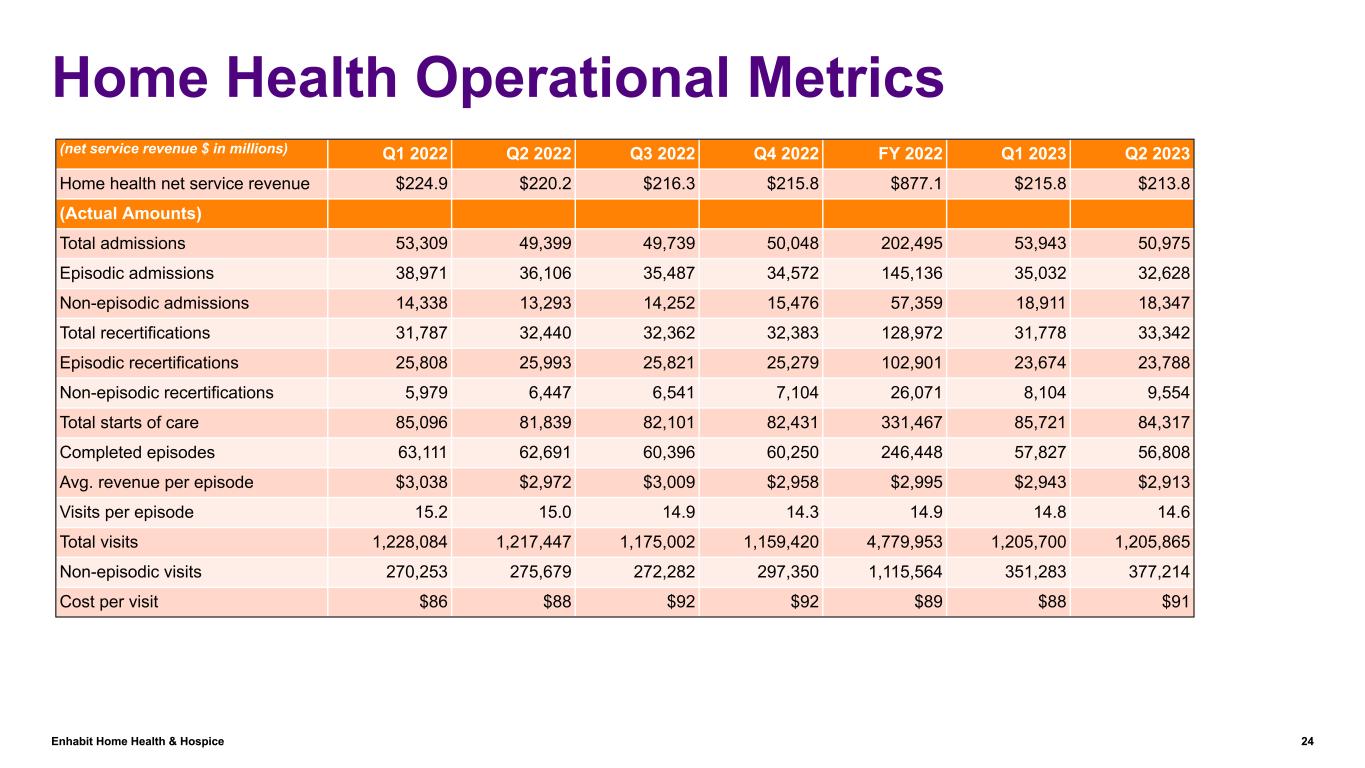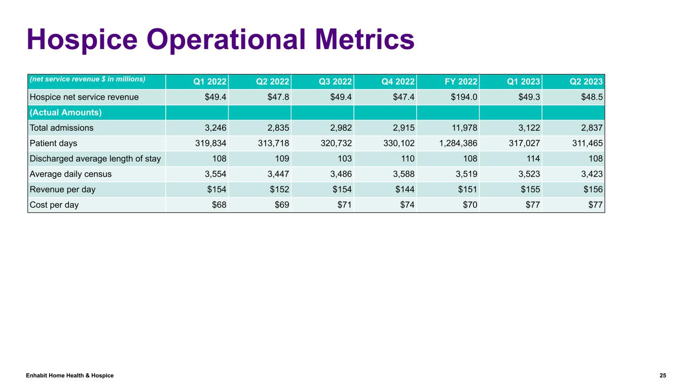 Enhabit Home Health & Hospice 24 Home Health Operational Metrics (net service revenue $ in millions) Q1 2022 Q2 2022 Q3 2022 Q4 2022 FY 2022 Q1 2023 Q2 2023 Home health net service revenue $224.9 $220.2 $216.3 $215.8 $877.1 $215.8 $213.8 (Actual Amounts) Total admissions 53,309 49,399 49,739 50,048 202,495 53,943 50,975 Episodic admissions 38,971 36,106 35,487 34,572 145,136 35,032 32,628 Non-episodic admissions 14,338 13,293 14,252 15,476 57,359 18,911 18,347 Total recertifications 31,787 32,440 32,362 32,383 128,972 31,778 33,342 Episodic recertifications 25,808 25,993 25,821 25,279 102,901 23,674 23,788 Non-episodic recertifications 5,979 6,447 6,541 7,104 26,071 8,104 9,554 Total starts of care 85,096 81,839 82,101 82,431 331,467 85,721 84,317 Completed episodes 63,111 62,691 60,396 60,250 246,448 57,827 56,808 Avg. revenue per episode $3,038 $2,972 $3,009 $2,958 $2,995 $2,943 $2,913 Visits per episode 15.2 15.0 14.9 14.3 14.9 14.8 14.6 Total visits 1,228,084 1,217,447 1,175,002 1,159,420 4,779,953 1,205,700 1,205,865 Non-episodic visits 270,253 275,679 272,282 297,350 1,115,564 351,283 377,214 Cost per visit $86 $88 $92 $92 $89 $88 $91