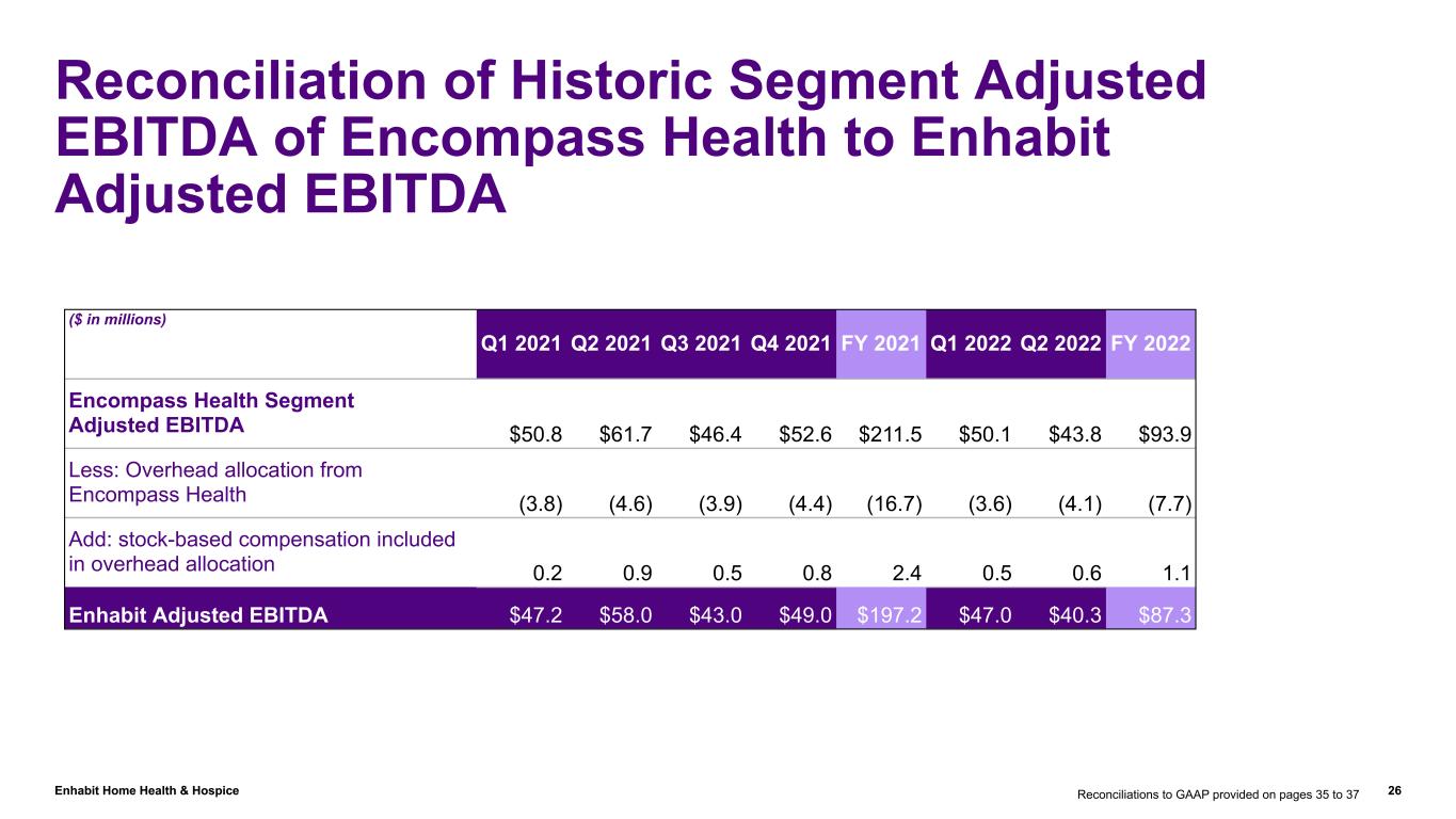 Enhabit Home Health & Hospice 25 Hospice Operational Metrics (net service revenue $ in millions) Q1 2022 Q2 2022 Q3 2022 Q4 2022 FY 2022 Q1 2023 Q2 2023 Hospice net service revenue $49.4 $47.8 $49.4 $47.4 $194.0 $49.3 $48.5 (Actual Amounts) Total admissions 3,246 2,835 2,982 2,915 11,978 3,122 2,837 Patient days 319,834 313,718 320,732 330,102 1,284,386 317,027 311,465 Discharged average length of stay 108 109 103 110 108 114 108 Average daily census 3,554 3,447 3,486 3,588 3,519 3,523 3,423 Revenue per day $154 $152 $154 $144 $151 $155 $156 Cost per day $68 $69 $71 $74 $70 $77 $77