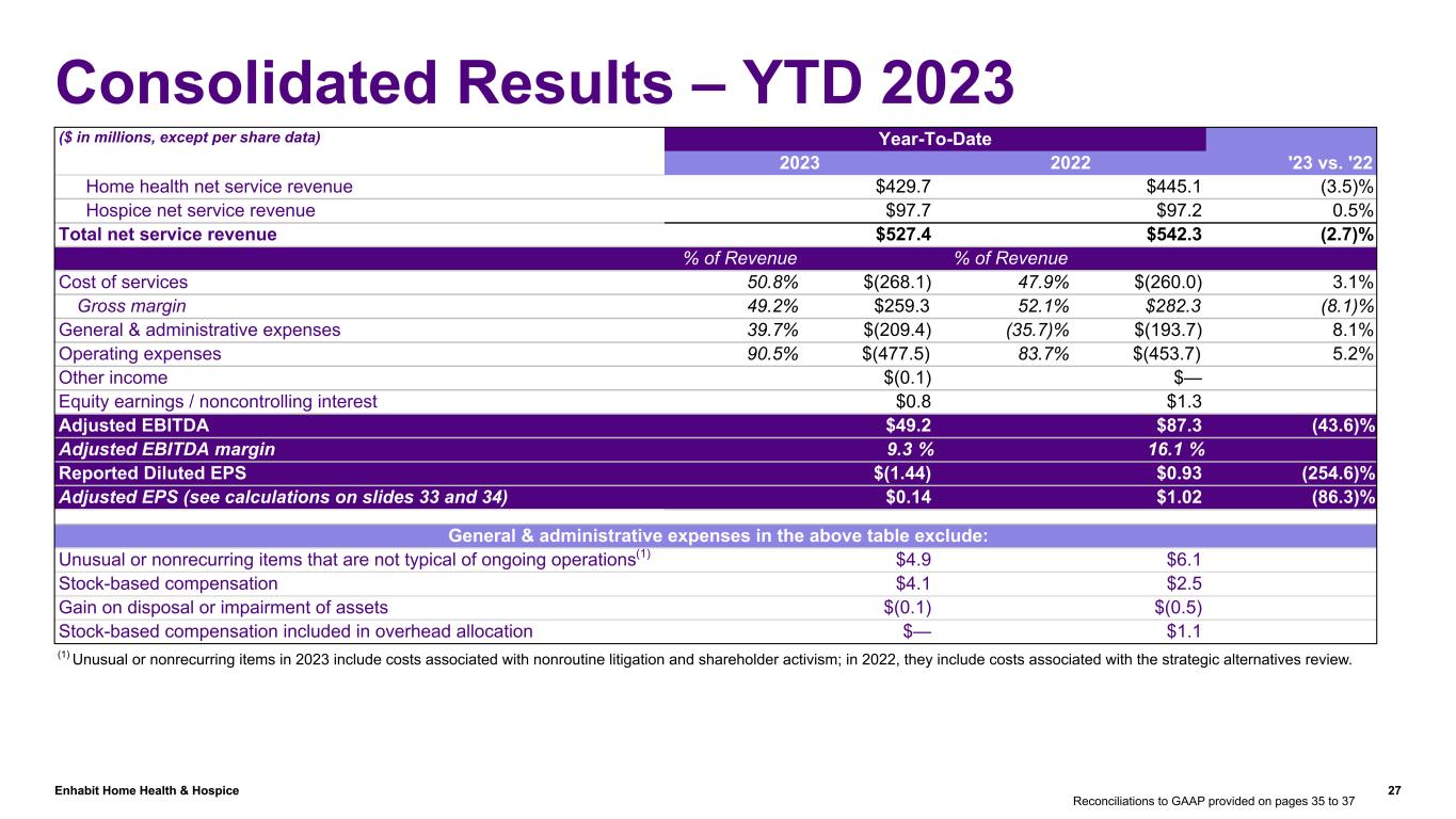 Enhabit Home Health & Hospice 26 Reconciliation of Historic Segment Adjusted EBITDA of Encompass Health to Enhabit Adjusted EBITDA PLACE HOLDER – WILL NEED: • EBITDA to Net income • Adjusted EPS to reported EPS and Net income ($ in millions) Q1 2021 Q2 2021 Q3 2021 Q4 2021 FY 2021 Q1 2022 Q2 2022 FY 2022 Encompass Health Segment Adjusted EBITDA $50.8 $61.7 $46.4 $52.6 $211.5 $50.1 $43.8 $93.9 Less: Overhead allocation from Encompass Health (3.8) (4.6) (3.9) (4.4) (16.7) (3.6) (4.1) (7.7) Add: stock-based compensation included in overhead allocation 0.2 0.9 0.5 0.8 2.4 0.5 0.6 1.1 Enhabit Adjusted EBITDA $47.2 $58.0 $43.0 $49.0 $197.2 $47.0 $40.3 $87.3 Reconciliations to GAAP provided on pages 35 to 37