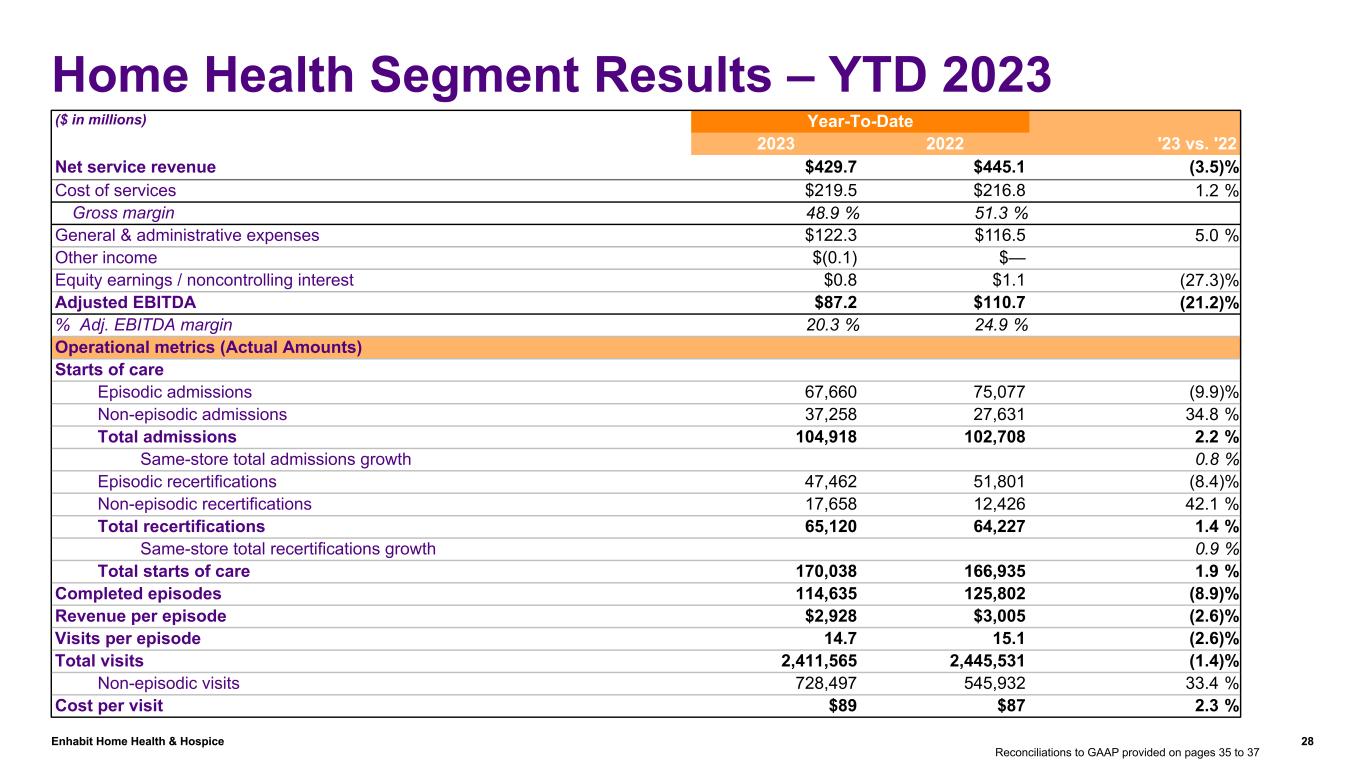 Enhabit Home Health & Hospice 27 Consolidated Results – YTD 2023 ($ in millions, except per share data) Year-To-Date '23 vs. '222023 2022 Home health net service revenue $429.7 $445.1 (3.5) % Hospice net service revenue $97.7 $97.2 0.5 % Total net service revenue $527.4 $542.3 (2.7) % % of Revenue % of Revenue Cost of services 50.8 % $(268.1) 47.9 % $(260.0) 3.1 % Gross margin 49.2 % $259.3 52.1 % $282.3 (8.1) % General & administrative expenses 39.7 % $(209.4) (35.7) % $(193.7) 8.1 % Operating expenses 90.5 % $(477.5) 83.7 % $(453.7) 5.2 % Other income $(0.1) $— Equity earnings / noncontrolling interest $0.8 $1.3 Adjusted EBITDA $49.2 $87.3 (43.6) % Adjusted EBITDA margin 9.3 % 16.1 % Reported Diluted EPS $(1.44) $0.93 (254.6) % Adjusted EPS (see calculations on slides 33 and 34) $0.14 $1.02 (86.3) % General & administrative expenses in the above table exclude: Unusual or nonrecurring items that are not typical of ongoing operations(1) $4.9 $6.1 Stock-based compensation $4.1 $2.5 Gain on disposal or impairment of assets $(0.1) $(0.5) Stock-based compensation included in overhead allocation $— $1.1 Reconciliations to GAAP provided on pages 35 to 37 (1) Unusual or nonrecurring items in 2023 include costs associated with nonroutine litigation and shareholder activism; in 2022, they include costs associated with the strategic alternatives review.