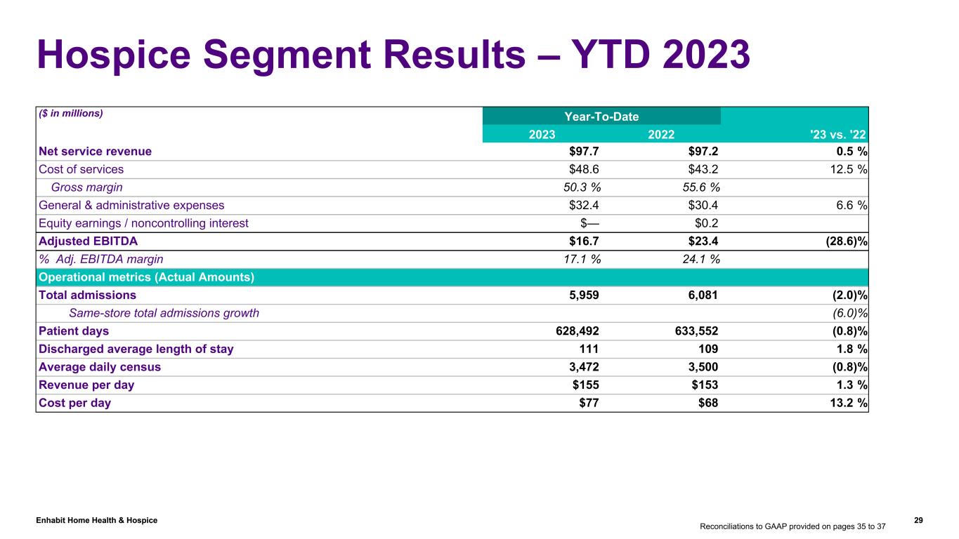 Enhabit Home Health & Hospice 28 Home Health Segment Results – YTD 2023 ($ in millions) Year-To-Date '23 vs. '222023 2022 Net service revenue $429.7 $445.1 (3.5) % Cost of services $219.5 $216.8 1.2 % Gross margin 48.9 % 51.3 % General & administrative expenses $122.3 $116.5 5.0 % Other income $(0.1) $— Equity earnings / noncontrolling interest $0.8 $1.1 (27.3) % Adjusted EBITDA $87.2 $110.7 (21.2) % % Adj. EBITDA margin 20.3 % 24.9 % Operational metrics (Actual Amounts) Starts of care Episodic admissions 67,660 75,077 (9.9) % Non-episodic admissions 37,258 27,631 34.8 % Total admissions 104,918 102,708 2.2 % Same-store total admissions growth 0.8 % Episodic recertifications 47,462 51,801 (8.4) % Non-episodic recertifications 17,658 12,426 42.1 % Total recertifications 65,120 64,227 1.4 % Same-store total recertifications growth 0.9 % Total starts of care 170,038 166,935 1.9 % Completed episodes 114,635 125,802 (8.9) % Revenue per episode $2,928 $3,005 (2.6) % Visits per episode 14.7 15.1 (2.6) % Total visits 2,411,565 2,445,531 (1.4) % Non-episodic visits 728,497 545,932 33.4 % Cost per visit $89 $87 2.3 % Reconciliations to GAAP provided on pages 35 to 37