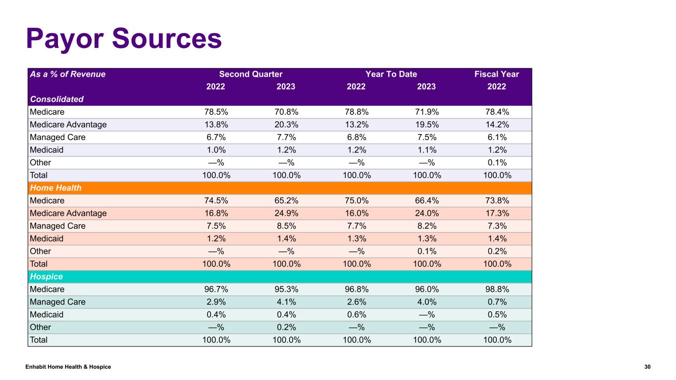 Enhabit Home Health & Hospice 30 Payor Sources As a % of Revenue Second Quarter Year To Date Fiscal Year 2022 2023 2022 2023 2022 Consolidated Medicare 78.5% 70.8% 78.8% 71.9% 78.4% Medicare Advantage 13.8% 20.3% 13.2% 19.5% 14.2% Managed Care 6.7% 7.7% 6.8% 7.5% 6.1% Medicaid 1.0% 1.2% 1.2% 1.1% 1.2% Other —% —% —% —% 0.1% Total 100.0% 100.0% 100.0% 100.0% 100.0% Home Health Medicare 74.5% 65.2% 75.0% 66.4% 73.8% Medicare Advantage 16.8% 24.9% 16.0% 24.0% 17.3% Managed Care 7.5% 8.5% 7.7% 8.2% 7.3% Medicaid 1.2% 1.4% 1.3% 1.3% 1.4% Other —% —% —% 0.1% 0.2% Total 100.0% 100.0% 100.0% 100.0% 100.0% Hospice Medicare 96.7% 95.3% 96.8% 96.0% 98.8% Managed Care 2.9% 4.1% 2.6% 4.0% 0.7% Medicaid 0.4% 0.4% 0.6% —% 0.5% Other —% 0.2% —% —% —% Total 100.0% 100.0% 100.0% 100.0% 100.0%