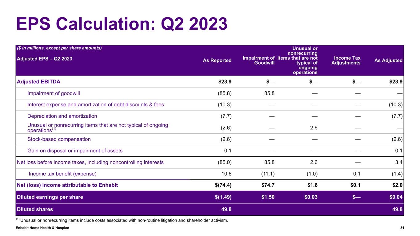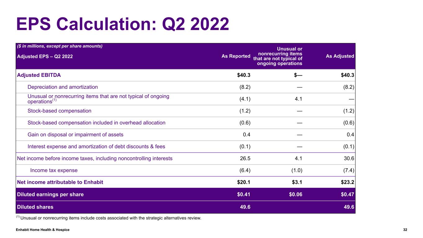 Enhabit Home Health & Hospice 31 EPS Calculation: Q2 2023 ($ in millions, except per share amounts) Adjusted EPS – Q2 2023 As Reported Impairment of Goodwill Unusual or nonrecurring items that are not typical of ongoing operations Income Tax Adjustments As Adjusted Adjusted EBITDA $23.9 $— $— $— $23.9 Impairment of goodwill (85.8) 85.8 — — — Interest expense and amortization of debt discounts & fees (10.3) — — — (10.3) Depreciation and amortization (7.7) — — — (7.7) Unusual or nonrecurring items that are not typical of ongoing operations(1) (2.6) — 2.6 — — Stock-based compensation (2.6) — — — (2.6) Gain on disposal or impairment of assets 0.1 — — — 0.1 Net loss before income taxes, including noncontrolling interests (85.0) 85.8 2.6 — 3.4 Income tax benefit (expense) 10.6 (11.1) (1.0) 0.1 (1.4) Net (loss) income attributable to Enhabit $(74.4) $74.7 $1.6 $0.1 $2.0 Diluted earnings per share $(1.49) $1.50 $0.03 $— $0.04 Diluted shares 49.8 49.8 (1) Unusual or nonrecurring items include costs associated with non-routine litigation and shareholder activism.