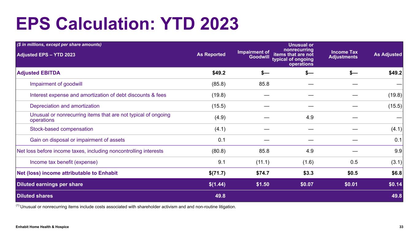 Enhabit Home Health & Hospice 32 EPS Calculation: Q2 2022 ($ in millions, except per share amounts) Adjusted EPS – Q2 2022 As Reported Unusual or nonrecurring items that are not typical of ongoing operations As Adjusted Adjusted EBITDA $40.3 $— $40.3 Depreciation and amortization (8.2) — (8.2) Unusual or nonrecurring items that are not typical of ongoing operations(1) (4.1) 4.1 — Stock-based compensation (1.2) — (1.2) Stock-based compensation included in overhead allocation (0.6) — (0.6) Gain on disposal or impairment of assets 0.4 — 0.4 Interest expense and amortization of debt discounts & fees (0.1) — (0.1) Net income before income taxes, including noncontrolling interests 26.5 4.1 30.6 Income tax expense (6.4) (1.0) (7.4) Net income attributable to Enhabit $20.1 $3.1 $23.2 Diluted earnings per share $0.41 $0.06 $0.47 Diluted shares 49.6 49.6 (1) Unusual or nonrecurring items include costs associated with the strategic alternatives review.