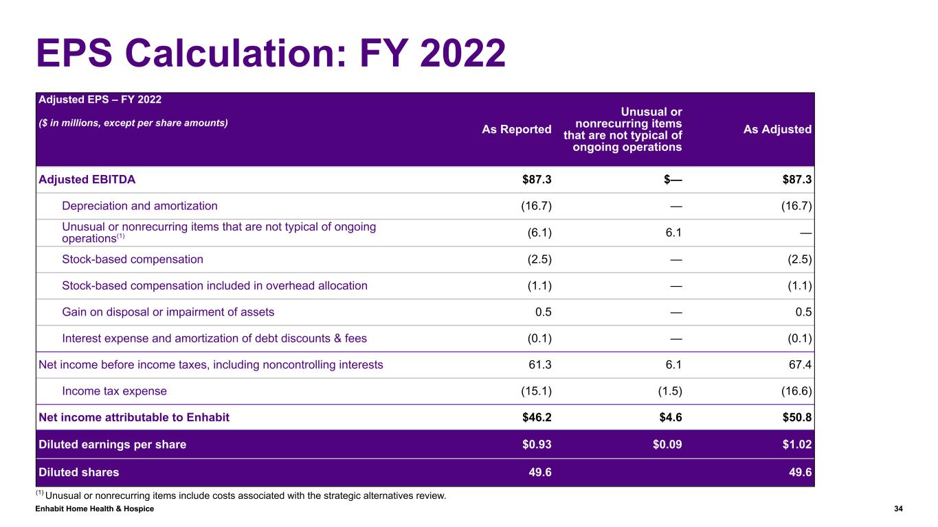 Enhabit Home Health & Hospice 33 EPS Calculation: YTD 2023 ($ in millions, except per share amounts) Adjusted EPS – YTD 2023 As Reported Impairment of Goodwill Unusual or nonrecurring items that are not typical of ongoing operations Income Tax Adjustments As Adjusted Adjusted EBITDA $49.2 $— $— $— $49.2 Impairment of goodwill (85.8) 85.8 — — — Interest expense and amortization of debt discounts & fees (19.8) — — — (19.8) Depreciation and amortization (15.5) — — — (15.5) Unusual or nonrecurring items that are not typical of ongoing operations (4.9) — 4.9 — — Stock-based compensation (4.1) — — — (4.1) Gain on disposal or impairment of assets 0.1 — — — 0.1 Net loss before income taxes, including noncontrolling interests (80.8) 85.8 4.9 — 9.9 Income tax benefit (expense) 9.1 (11.1) (1.6) 0.5 (3.1) Net (loss) income attributable to Enhabit $(71.7) $74.7 $3.3 $0.5 $6.8 Diluted earnings per share $(1.44) $1.50 $0.07 $0.01 $0.14 Diluted shares 49.8 49.8 (1) Unusual or nonrecurring items include costs associated with shareholder activism and and non-routine litigation.