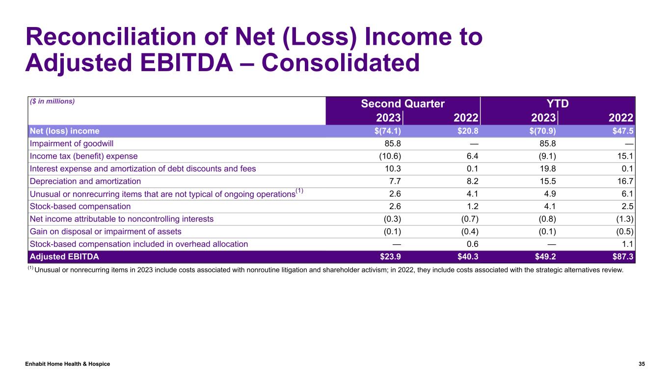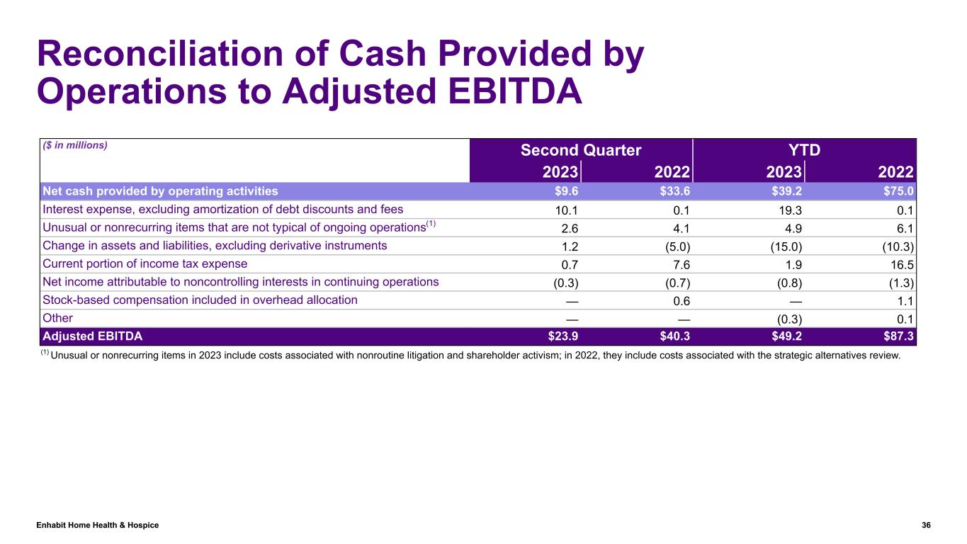Enhabit Home Health & Hospice 35 Reconciliation of Net (Loss) Income to Adjusted EBITDA – Consolidated ($ in millions) Second Quarter YTD 2023 2022 2023 2022 Net (loss) income $(74.1) $20.8 $(70.9) $47.5 Impairment of goodwill 85.8 — 85.8 — Income tax (benefit) expense (10.6) 6.4 (9.1) 15.1 Interest expense and amortization of debt discounts and fees 10.3 0.1 19.8 0.1 Depreciation and amortization 7.7 8.2 15.5 16.7 Unusual or nonrecurring items that are not typical of ongoing operations(1) 2.6 4.1 4.9 6.1 Stock-based compensation 2.6 1.2 4.1 2.5 Net income attributable to noncontrolling interests (0.3) (0.7) (0.8) (1.3) Gain on disposal or impairment of assets (0.1) (0.4) (0.1) (0.5) Stock-based compensation included in overhead allocation — 0.6 — 1.1 Adjusted EBITDA $23.9 $40.3 $49.2 $87.3 (1) Unusual or nonrecurring items in 2023 include costs associated with nonroutine litigation and shareholder activism; in 2022, they include costs associated with the strategic alternatives review.