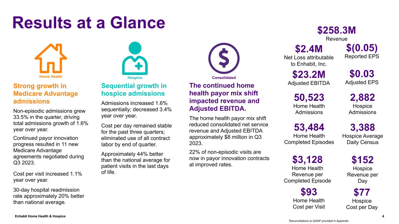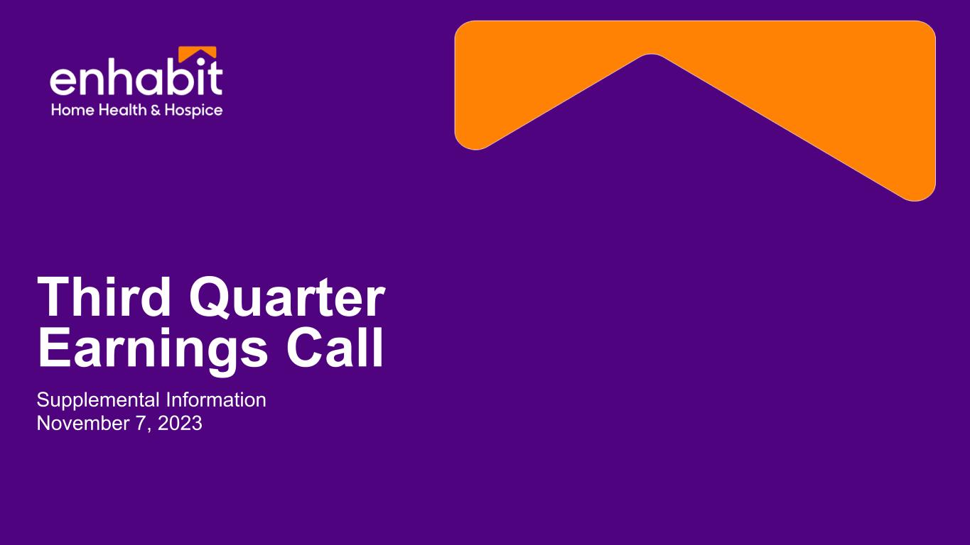 Enhabit Home Health & Hospice 2 Disclaimer Forward looking statements Statements contained in this presentation which are not historical facts, such as those relating to future events, projections, financial guidance, legislative or regulatory developments, strategy or growth opportunities, are forward-looking statements within the meaning of the Private Securities Litigation Reform Act of 1995. All such estimates, projections, and forward-looking information speak only as of the date hereof, and Enhabit undertakes no duty to publicly update or revise such forward-looking information, whether as a result of new information, future events, or otherwise. Such forward-looking statements are necessarily estimates based upon current information and involve a number of risks and uncertainties. Actual events or results may differ materially from those anticipated in these forward-looking statements as a result of a variety of factors. While it is impossible to identify all such factors, factors which could cause actual events or results to differ materially from those estimated by Enhabit include, but are not limited to, our ability to execute on our strategic plans, regulatory and other developments impacting the markets for our services, changes in reimbursement rates, general economic conditions, our ability to attract and retain key management personnel and healthcare professionals, potential disruptions or breaches of our or our vendors’ information systems, the outcome of litigation, our ability to successfully complete and integrate de novo developments, acquisitions, investments, and joint ventures, our ability to control costs, particularly labor and employee benefit costs, and that our review of strategic alternatives will result in our pursuing any strategic transaction, or that we will successfully consummate any particular strategic transaction on attractive terms or at all. Our annual report on Form 10-K and quarterly reports on Form 10-Q, each of which can be found on the Company’s website at http://investors.ehab.com and the SEC’s website at www.sec.gov, discuss other risks and factors that could cause actual results to differ materially from those expressed or implied by any forward-looking statement in this presentation. We urge you to consider all of the risks, uncertainties and factors identified above or discussed in such reports carefully in evaluating the forward-looking statements in this presentation. Note regarding presentation of non-GAAP financial measures This presentation includes certain “non-GAAP financial measures” as defined in Regulation G under the Securities Exchange Act of 1934, including Adjusted EBITDA, Adjusted EBITDA margin, Adjusted earnings per share, and Adjusted free cash flow. Reconciliations of these non-GAAP financial measures to the most directly comparable financial measures calculated in accordance with GAAP are presented at the end of this presentation. Our Form 8-K, filed with the SEC as of the date of this presentation, provides further explanation and disclosure regarding Enhabit’s use of non-GAAP financial measures and should be read in conjunction with this supplemental information. Note regarding presentation of same-store comparisons The Company uses “same-store” comparisons to explain the changes in certain performance metrics and line items within its financial statements. Same-store comparisons are calculated based on home health and hospice locations open throughout both the full current period and the immediately prior period presented. These comparisons include the financial results of market consolidation transactions in existing markets, as it is difficult to determine, with precision, the incremental impact of these transactions on the Company’s results of operations.