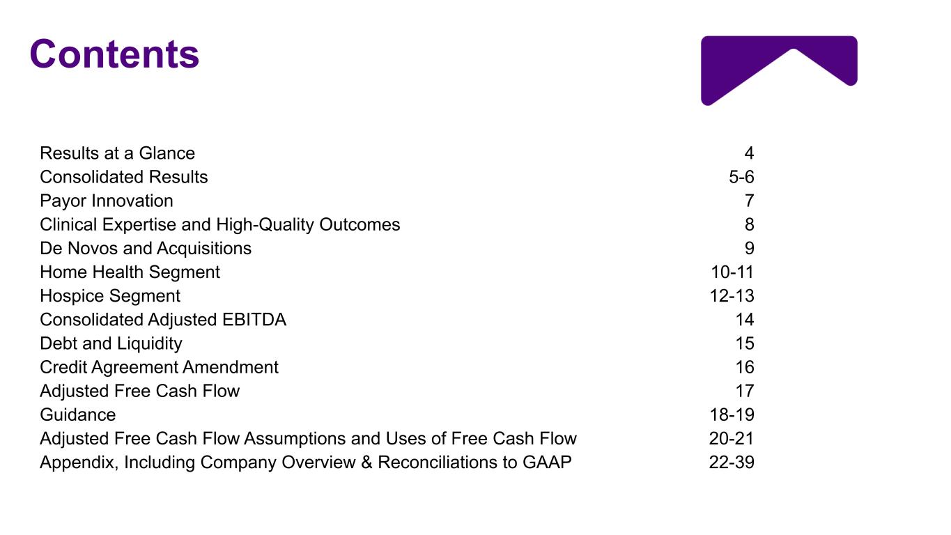 Contents Results at a Glance 4 Consolidated Results 5-6 Payor Innovation 7 Clinical Expertise and High-Quality Outcomes 8 De Novos and Acquisitions 9 Home Health Segment 10-11 Hospice Segment 12-13 Consolidated Adjusted EBITDA 14 Debt and Liquidity 15 Credit Agreement Amendment 16 Adjusted Free Cash Flow 17 Guidance 18-19 Adjusted Free Cash Flow Assumptions and Uses of Free Cash Flow 20-21 Appendix, Including Company Overview & Reconciliations to GAAP 22-39