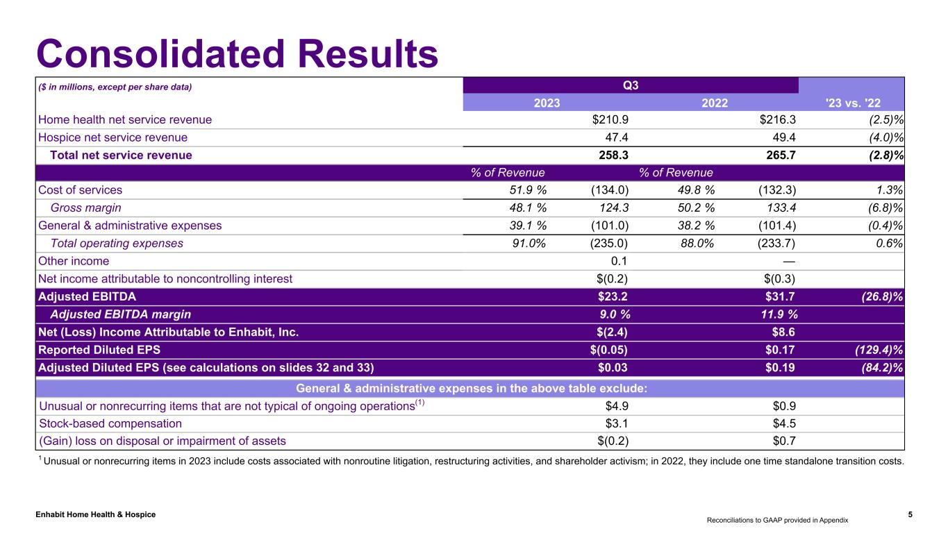 Enhabit Home Health & Hospice 4 Strong growth in Medicare Advantage admissions Non-episodic admissions grew 33.5% in the quarter, driving total admissions growth of 1.6% year over year. Continued payor innovation progress resulted in 11 new Medicare Advantage agreements negotiated during Q3 2023. Cost per visit increased 1.1% year over year. 30-day hospital readmission rate approximately 20% better than national average. $258.3M Revenue $23.2M Adjusted EBITDA 50,523 Home Health Admissions 2,882 Hospice Admissions 53,484 Home Health Completed Episodes 3,388 Hospice Average Daily Census Sequential growth in hospice admissions Admissions increased 1.6% sequentially; decreased 3.4% year over year. Cost per day remained stable for the past three quarters; eliminated use of all contract labor by end of quarter. Approximately 44% better than the national average for patient visits in the last days of life. $3,128 Home Health Revenue per Completed Episode $152 Hospice Revenue per Day $93 Home Health Cost per Visit $77 Hospice Cost per Day Reconciliations to GAAP provided in Appendix Results at a Glance The continued home health payor mix shift impacted revenue and Adjusted EBITDA. The home health payor mix shift reduced consolidated net service revenue and Adjusted EBITDA approximately $8 million in Q3 2023. 22% of non-episodic visits are now in payor innovation contracts at improved rates. $(0.05) Reported EPS $0.03 Adjusted EPS Home Health Hospice $2.4M Net Loss attributable to Enhabit, Inc. Consolidated