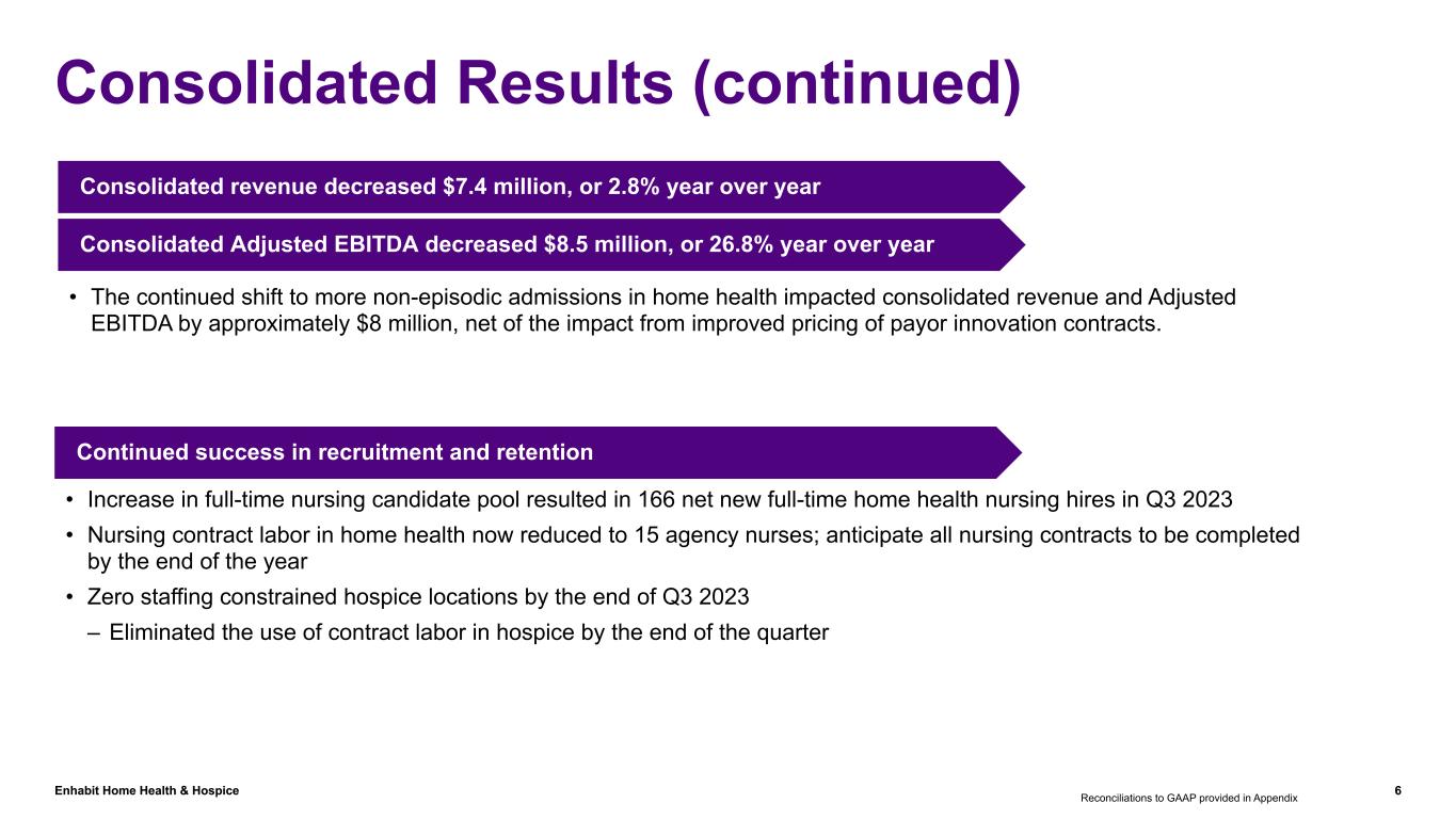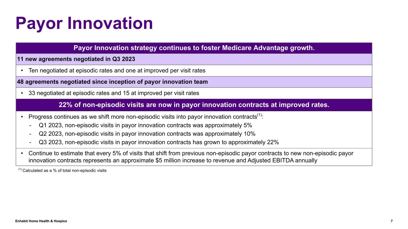 Enhabit Home Health & Hospice 6 Consolidated Results (continued) • The continued shift to more non-episodic admissions in home health impacted consolidated revenue and Adjusted EBITDA by approximately $8 million, net of the impact from improved pricing of payor innovation contracts. Consolidated Adjusted EBITDA decreased $8.5 million, or 26.8% year over year Consolidated revenue decreased $7.4 million, or 2.8% year over year Reconciliations to GAAP provided in Appendix Continued success in recruitment and retention • Increase in full-time nursing candidate pool resulted in 166 net new full-time home health nursing hires in Q3 2023 • Nursing contract labor in home health now reduced to 15 agency nurses; anticipate all nursing contracts to be completed by the end of the year • Zero staffing constrained hospice locations by the end of Q3 2023 – Eliminated the use of contract labor in hospice by the end of the quarter