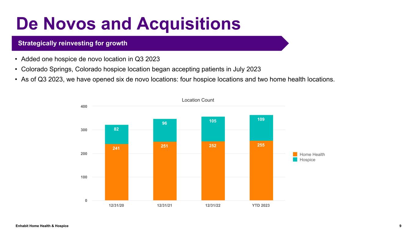 Enhabit Home Health & Hospice 8 Clinical Expertise and High-Quality Outcomes Enhabit National Average % Better Than Average QoPC Star Rating1 3.6 3.0. 20.0% 93% of our home health agencies are 3 Stars or higher; 37% are 4 Stars or higher1 HHCAHPS Star Rating2 3.8 3.6 5.6% 99% of our home health agencies are 3 Stars or higher; 72% are 4 Stars or higher2 30-Day Hospital Readmission Rate3 14.5 18.2 20.3% % of patients readmitted to an acute care hospital within 30 days of start of care or resumption of care Patient Visits in Last Days of Life4 78.0% 54.2% 44.0% % of patients who received in person visits from RN or medical social worker on at least two out of the final three days of the patient’s life Standardized Protocols Motivated Clinicians Disciplined Use of Technology Superior Performance ü ü ü ü 1) Quality of Patient Care (QoPC) Star Ratings as of October 2023 for dates of service full year 2022 2) Home Health Care Consumer Assessment of Healthcare Providers (HHCAHPS) Patient Survey Star Ratings as of October 2023 for dates of service April 1, 2022 - September 30, 2023 3) Research Institute for Home Care 2022 Chartbook (data from Medicare Standard Analytics Files for CY 2021), EHAB data is as of Q2 2023 (all payors) 4) Medicare fee for service claims data for Q2 2022 to Q1 2023, source Trella Health