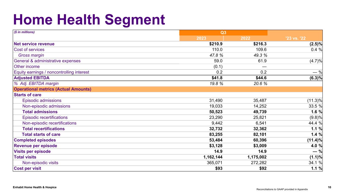 Enhabit Home Health & Hospice 9 De Novos and Acquisitions Strategically reinvesting for growth • Added one hospice de novo location in Q3 2023 • Colorado Springs, Colorado hospice location began accepting patients in July 2023 • As of Q3 2023, we have opened six de novo locations: four hospice locations and two home health locations. Home Health Hospice Total December 31, 2020 241 82 323 De Novo Locations Opened 0 3 3 Acquired Locations 11 11 22 Merged/Closed Locations (1) 0 (1) December 31, 2021 251 96 347 De Novo Locations Opened 1 3 4 Acquired Locations 2 6 8 Merged/Closed Locations (2) 0 (2) December 31, 2022 252 105 357 De Novo Locations Opened 2 4 6 Acquired Locations 1 0 1 YTD 2023 255 109 364 241 251 252 255 82 96 105 109 Home Health Hospice 12/31/20 12/31/21 12/31/22 YTD 2023 0 100 200 300 400 Location Count