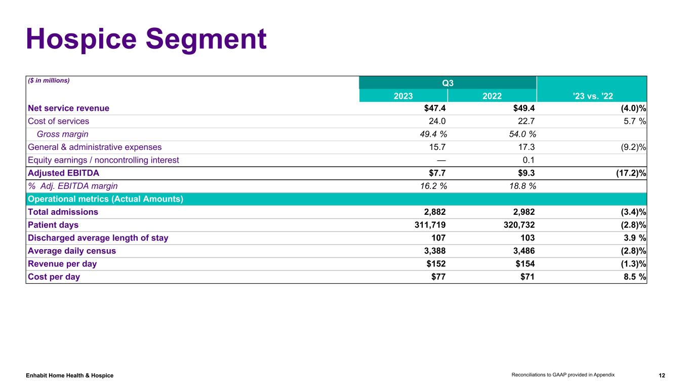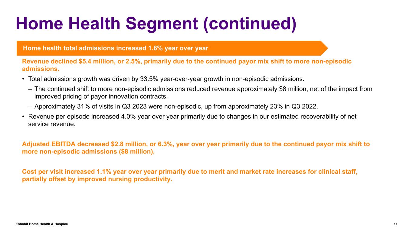 Enhabit Home Health & Hospice 10 Home Health Segment ($ in millions) Q3 '23 vs. '222023 2022 Net service revenue $210.9 $216.3 (2.5) % Cost of services 110.0 109.6 0.4 % Gross margin 47.8 % 49.3 % General & administrative expenses 59.0 61.9 (4.7) % Other income (0.1) — Equity earnings / noncontrolling interest 0.2 0.2 — % Adjusted EBITDA $41.8 $44.6 (6.3) % % Adj. EBITDA margin 19.8 % 20.6 % Operational metrics (Actual Amounts) Starts of care Episodic admissions 31,490 35,487 (11.3) % Non-episodic admissions 19,033 14,252 33.5 % Total admissions 50,523 49,739 1.6 % Episodic recertifications 23,290 25,821 (9.8) % Non-episodic recertifications 9,442 6,541 44.4 % Total recertifications 32,732 32,362 1.1 % Total starts of care 83,255 82,101 1.4 % Completed episodes 53,484 60,396 (11.4) % Revenue per episode $3,128 $3,009 4.0 % Visits per episode 14.9 14.9 — % Total visits 1,162,144 1,175,002 (1.1) % Non-episodic visits 365,071 272,282 34.1 % Cost per visit $93 $92 1.1 % Reconciliations to GAAP provided in Appendix